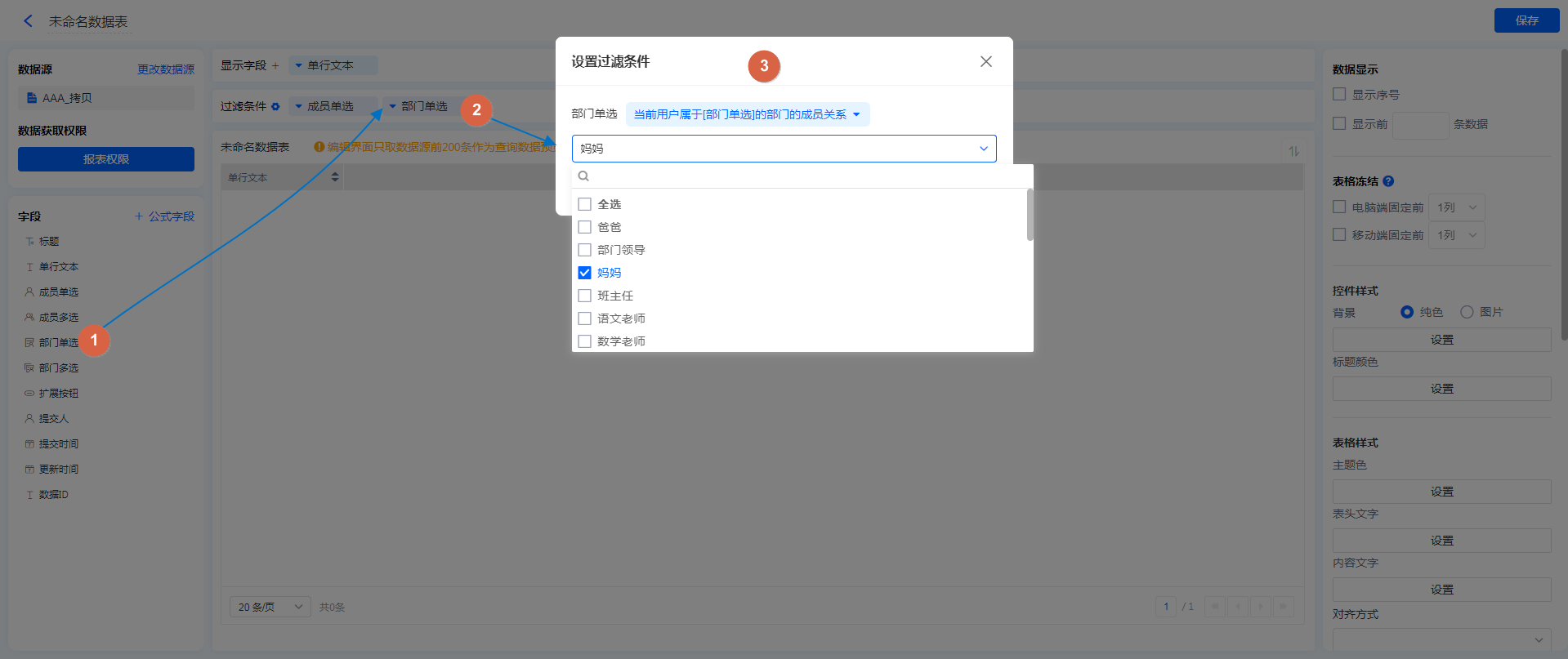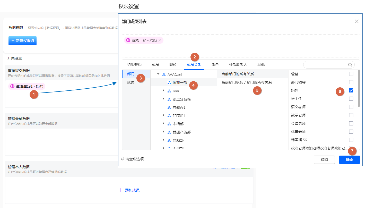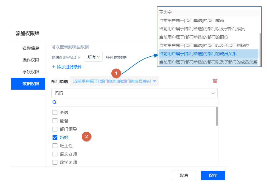 表单/报表的权限组设置成员关系 将权限分享给:指定部门(及子部门)的成员的妈妈;