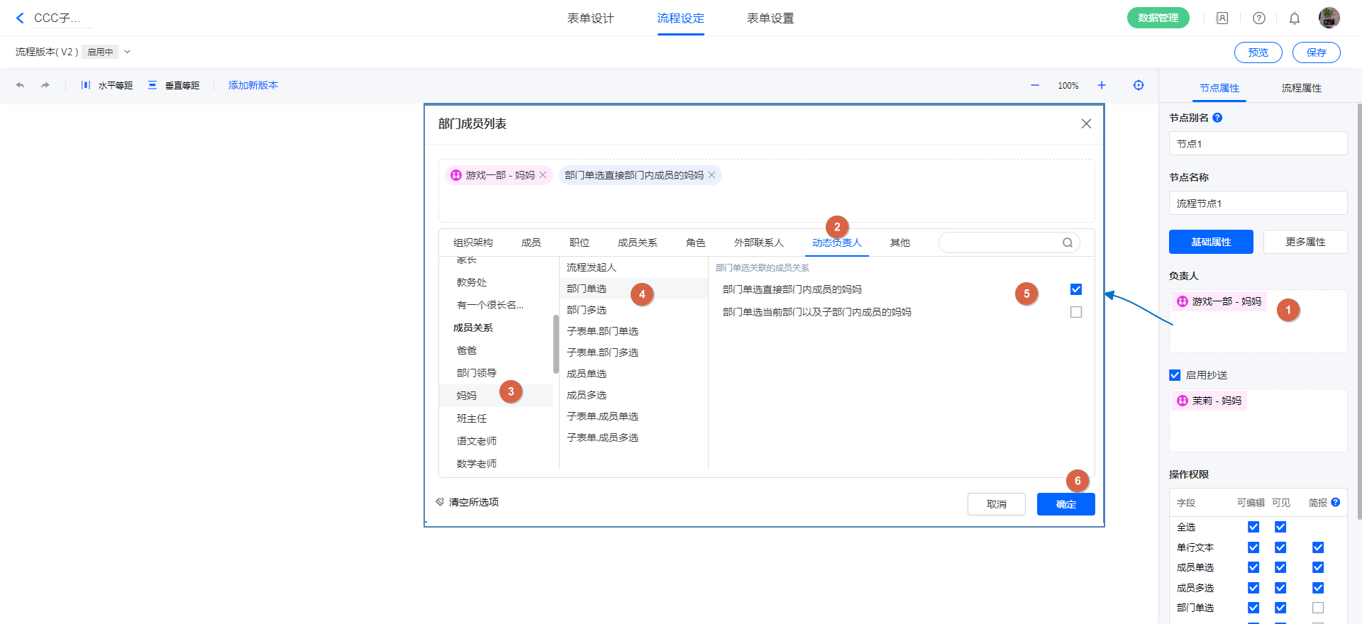 流程负责人/抄送人/转交人,设置成员关系 流程负责人为:指定部门(及子部门)的成员的妈妈;