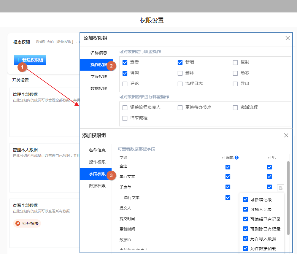 设定【自定义权限组】的「操作权限」、「字段权限」和「子表单操作权限」。