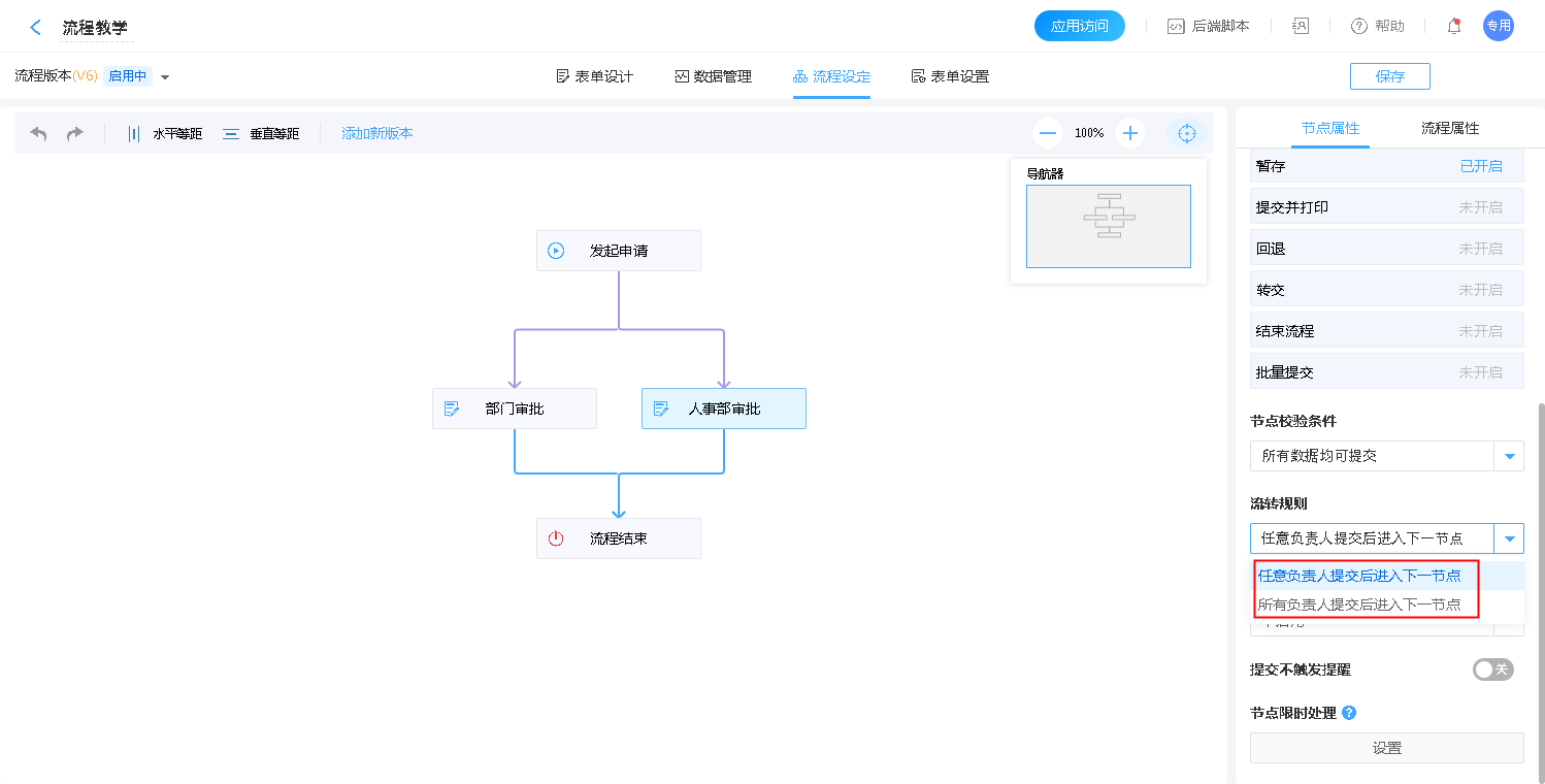 如果需要所有负责人提交后进入下一节点,则当所有在此节点的负责人都对此流程节点做了操作,提交或结束流程后,该节点才会继续向下执行,反之亦然。