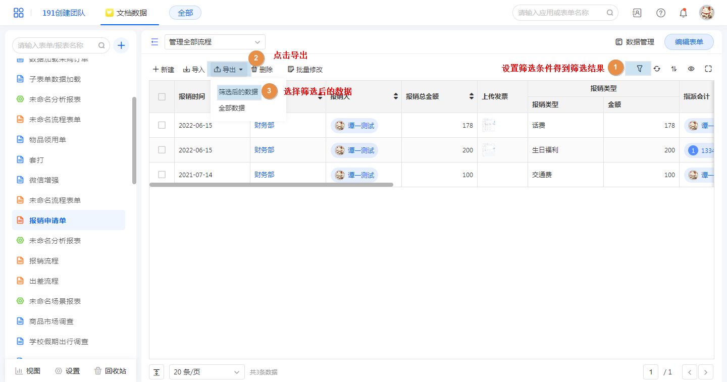 先设置查询字段和条件,筛选出所需数据,然后【导出】——【筛选后的数据】,最后导出这些字段所对应的满足查询条件的数据。