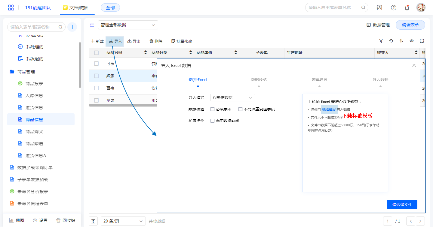 在表单中导入数据时,会出现错误提示,然后在该页面下载「具体错误信息」。