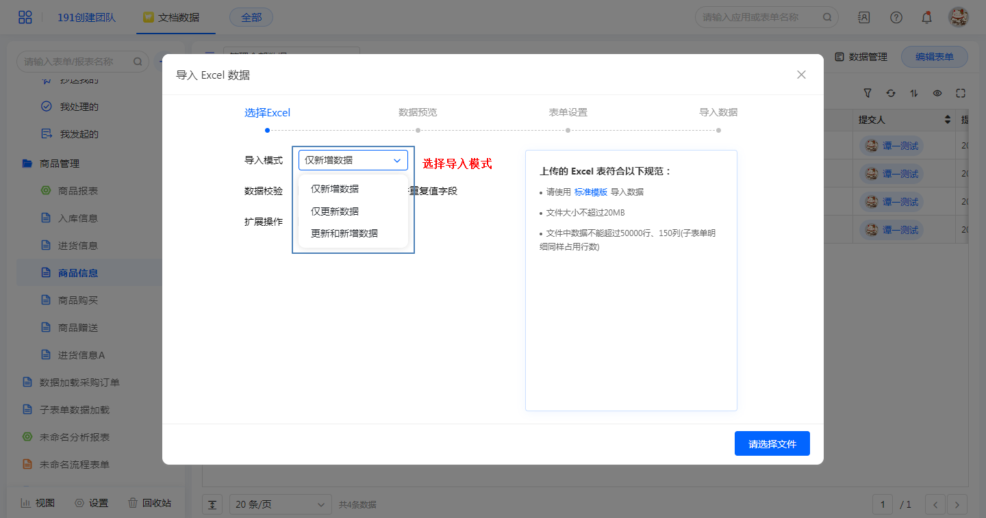 适用于对已导出数据进行修改及新增后再次导入,即将表单中的已有数据进行更新并将excel中新增的数据同步新增到表单。