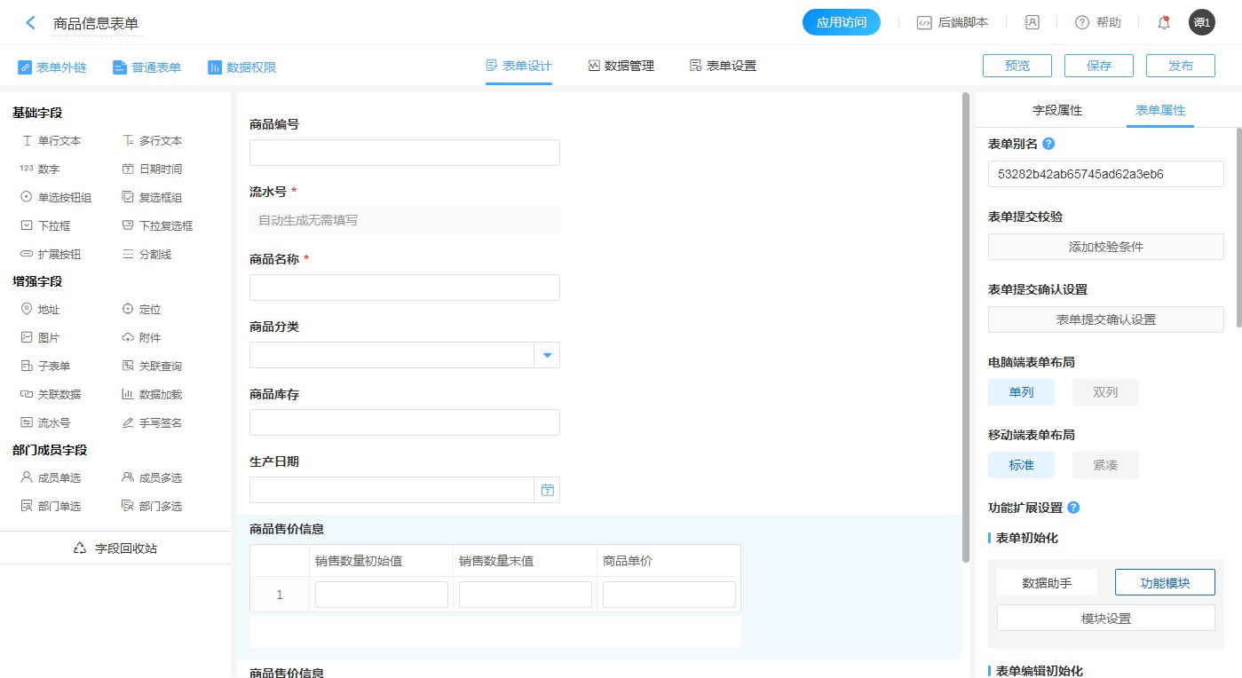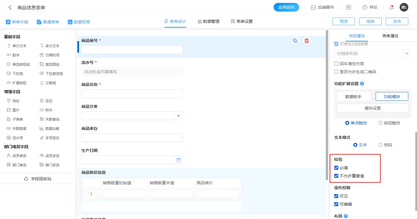 如商品信息表中的『商品编号』是必填字段且值不允许重复。
