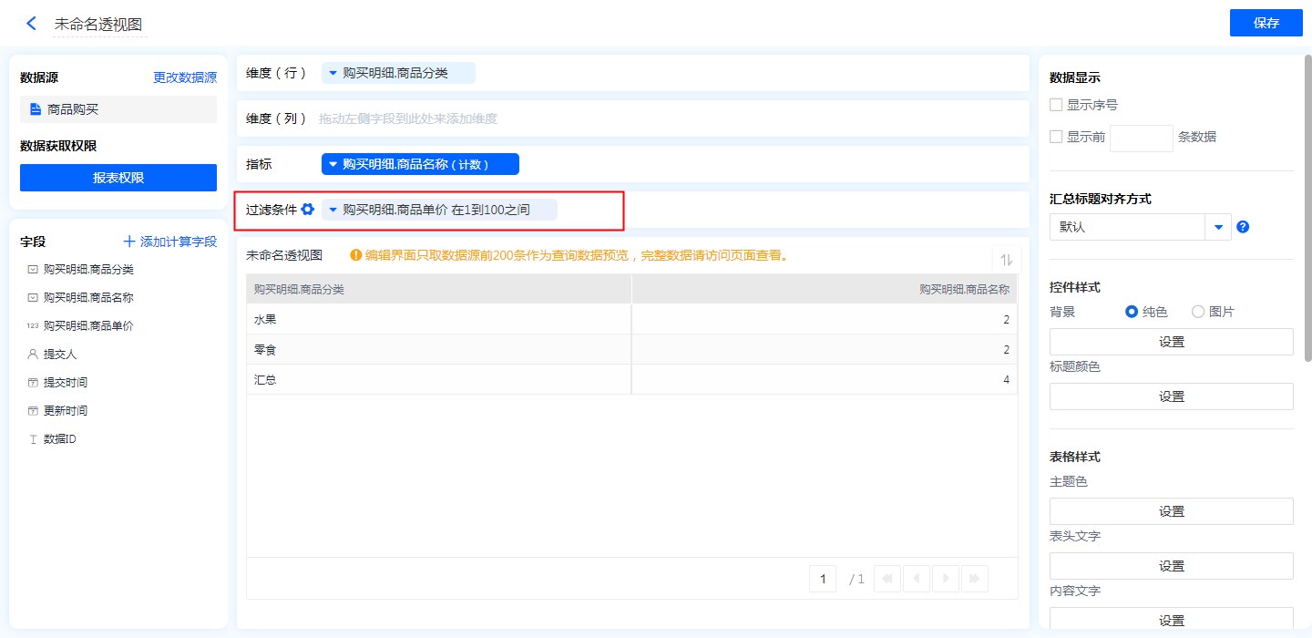 可以将透视图中显示的数据,通过对过滤条件进行设置,只显示符合条件的数据。详见过滤条件。