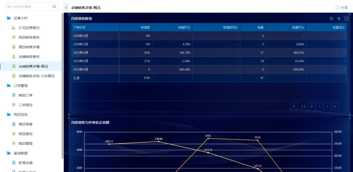 透视图适合对数据进行汇总和分析的场景,如:运营分析系统中,店铺销售详情-概况表单中就利用透视图的汇总分析功能,对销售额、销售环比、销售额同比、销量、销量环比、销量同比等几个关键数据进行了汇总和分析,为企业掌握经营情况提供有效的数字依据。