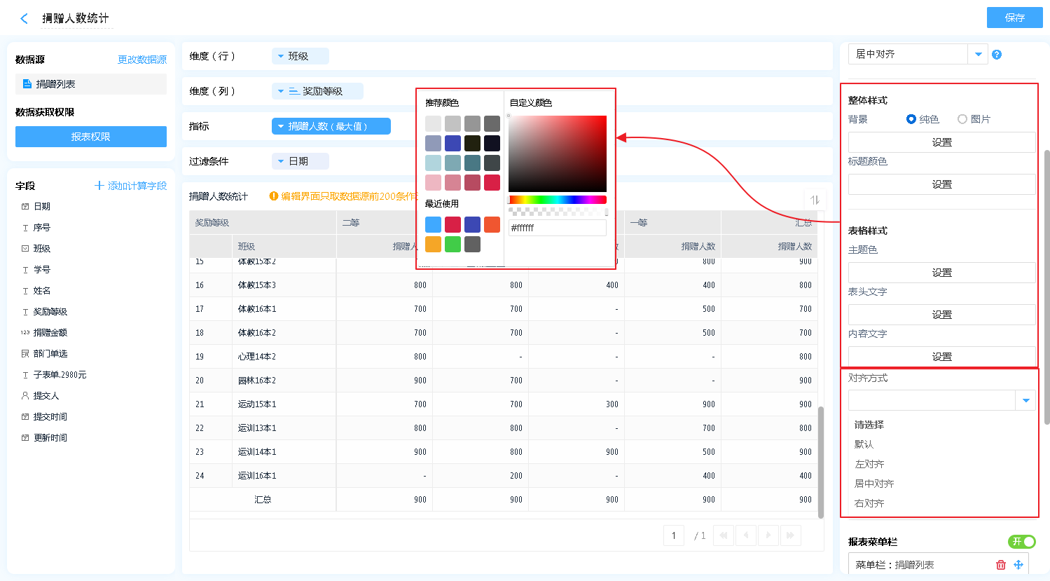 数据内部文字的颜色、表头的显示颜色以及对齐方式等