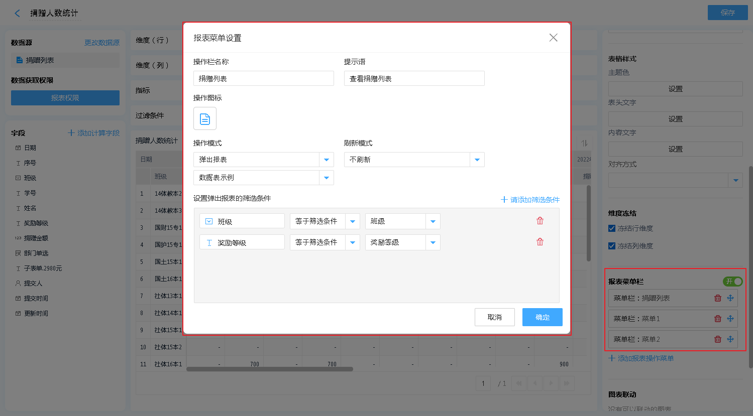 报表菜单 支持 弹出表单、弹出报表、数据助手