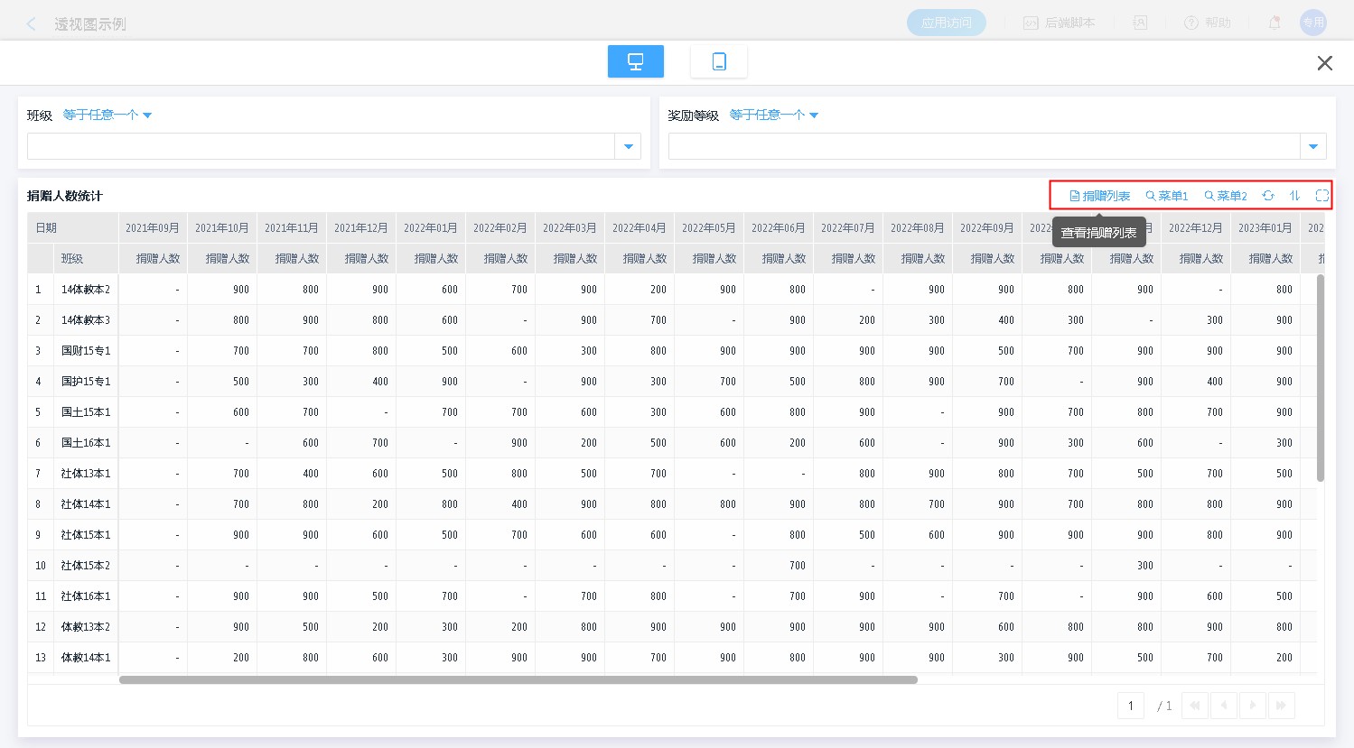 平台的报表体系,支持报表菜单,在报表的表头上方,支持添加自定义按钮,可对接数据助手或者弹出表单、报表。