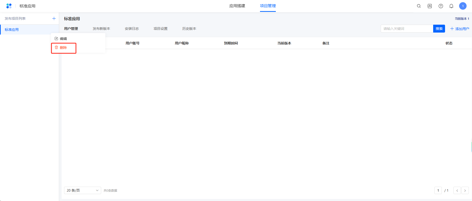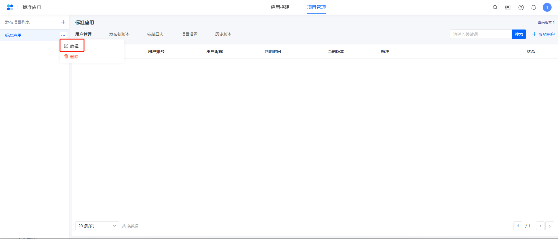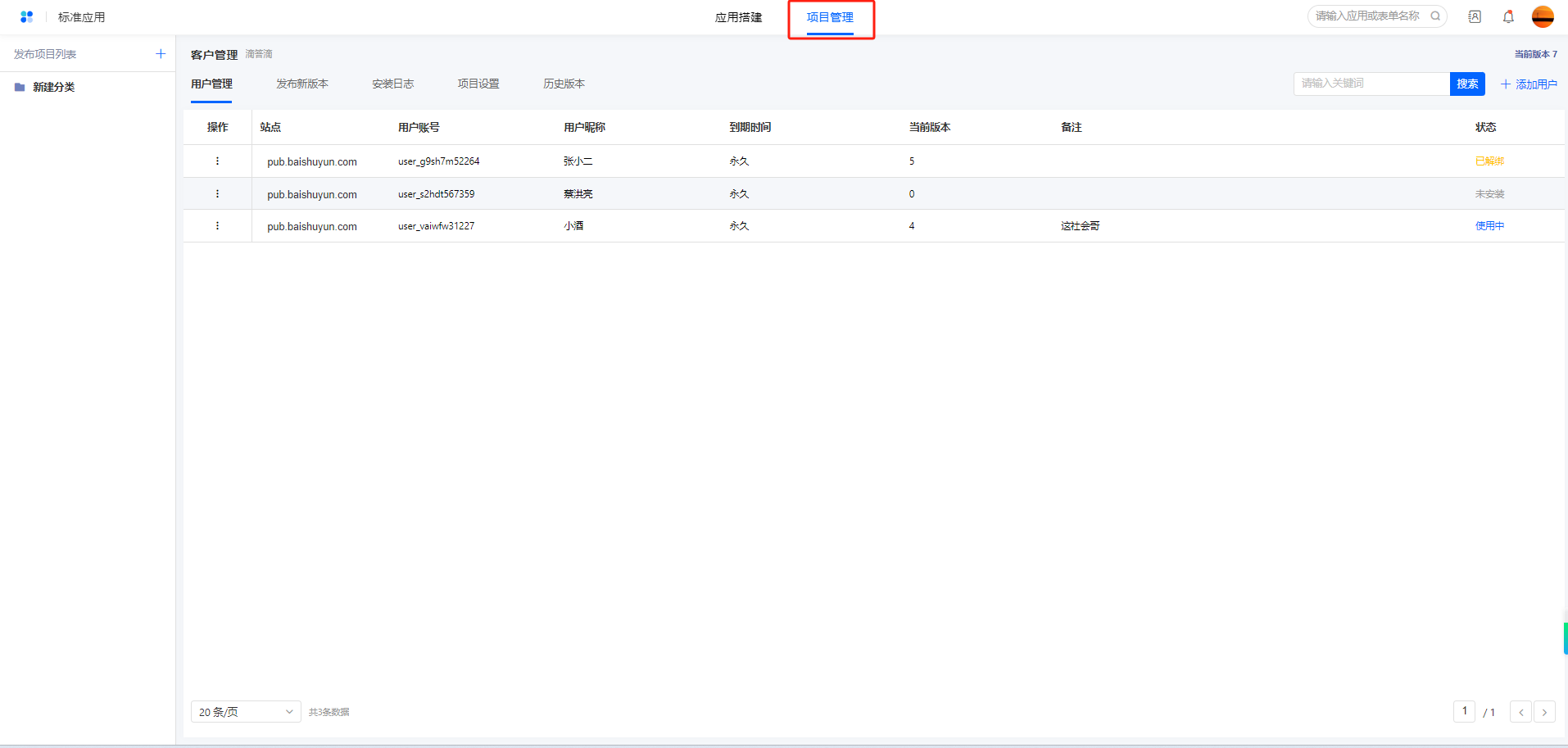 标准应用界面,点击「项目管理」进入项目管理页面。如下图所示: