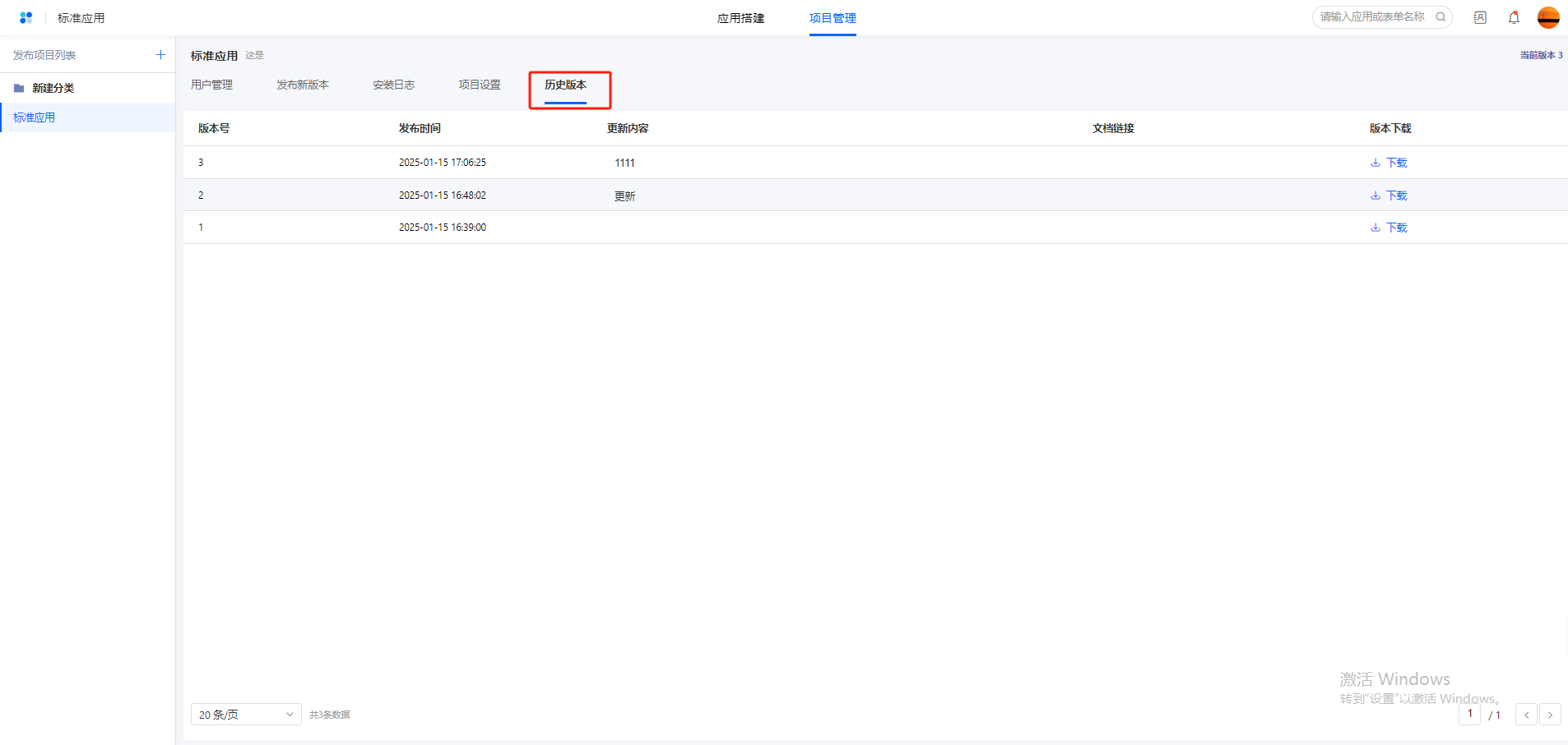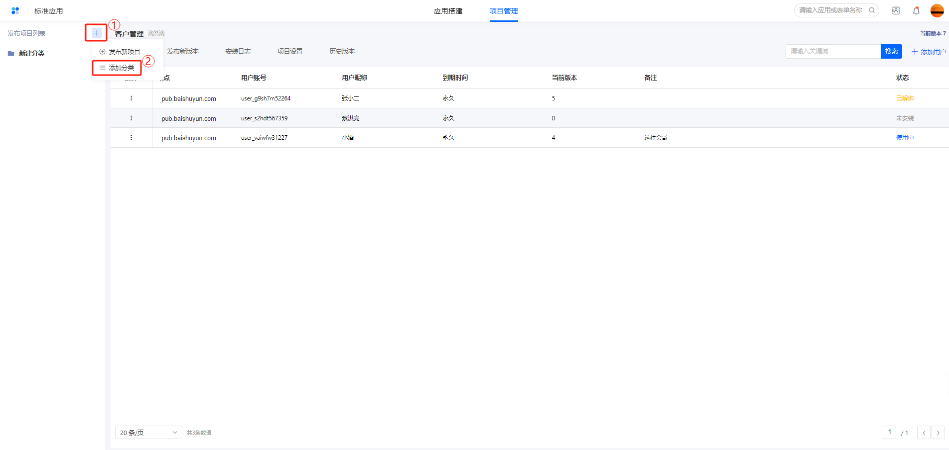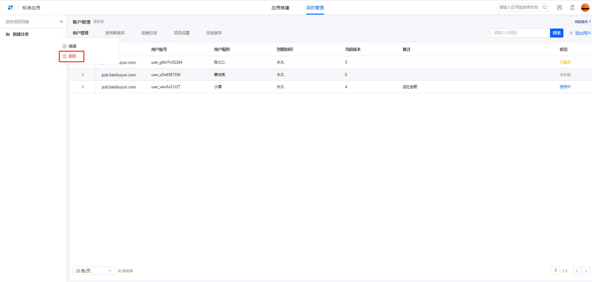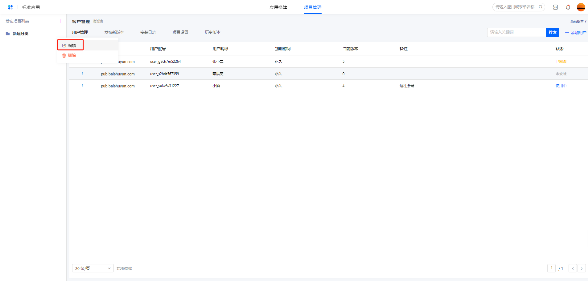 标准应用界面,点击「项目管理」进入项目管理页面。如下图所示: