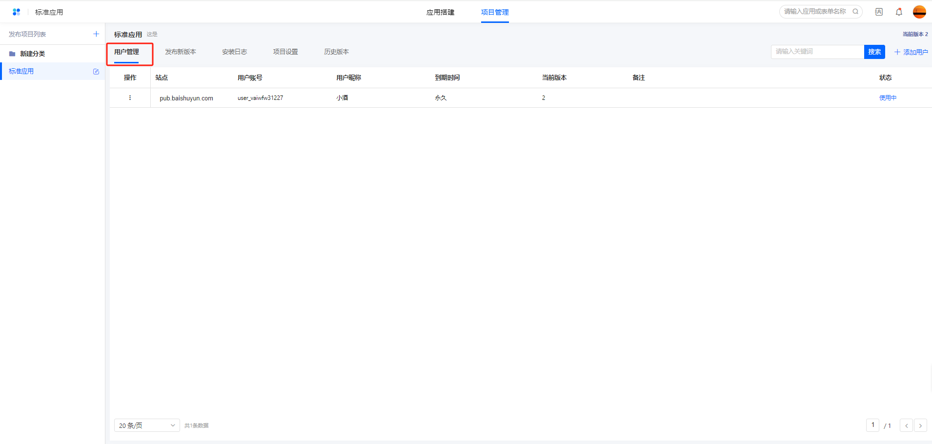 点击左侧项目,右侧面板「用户管理」显示所有安装的用户信息。如下图所示: