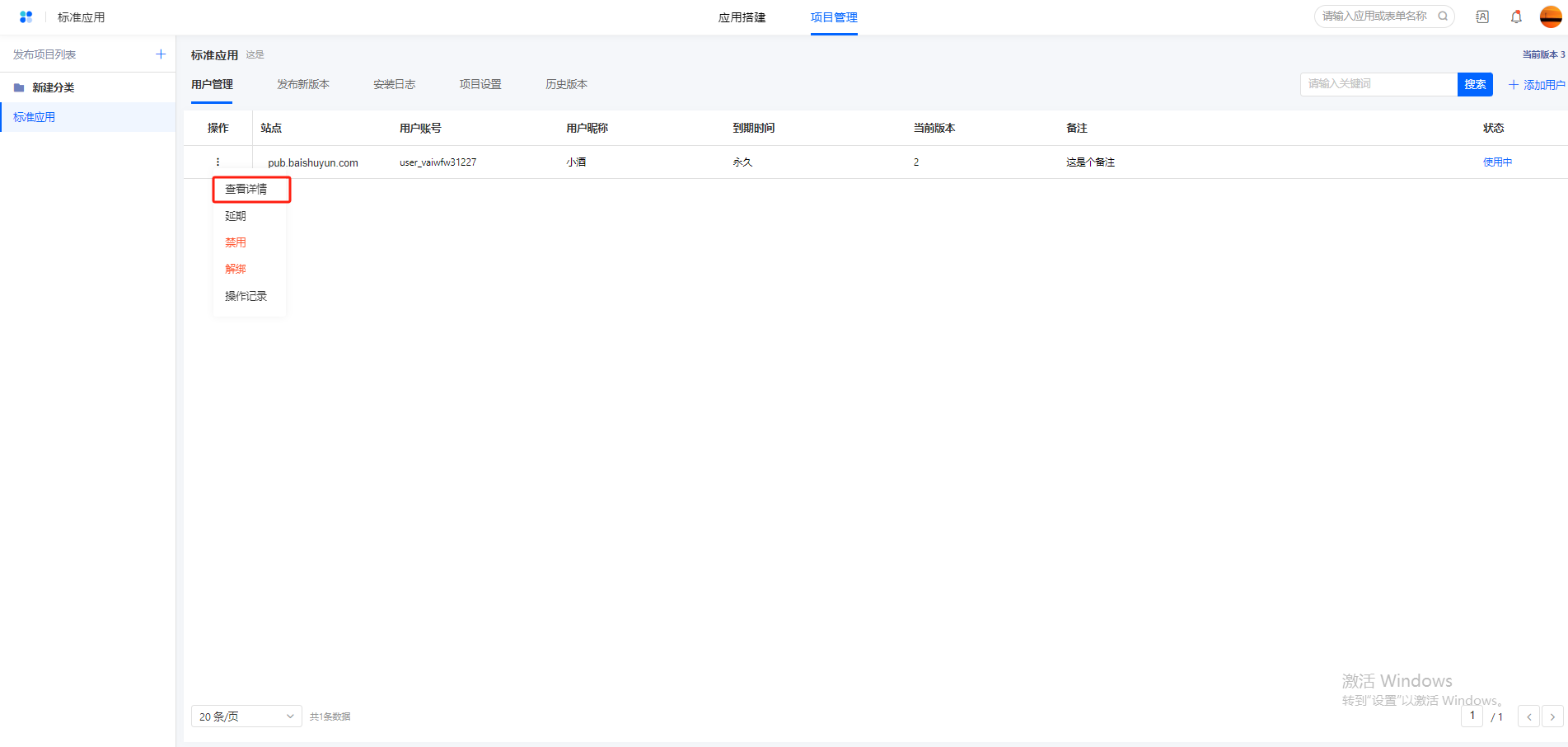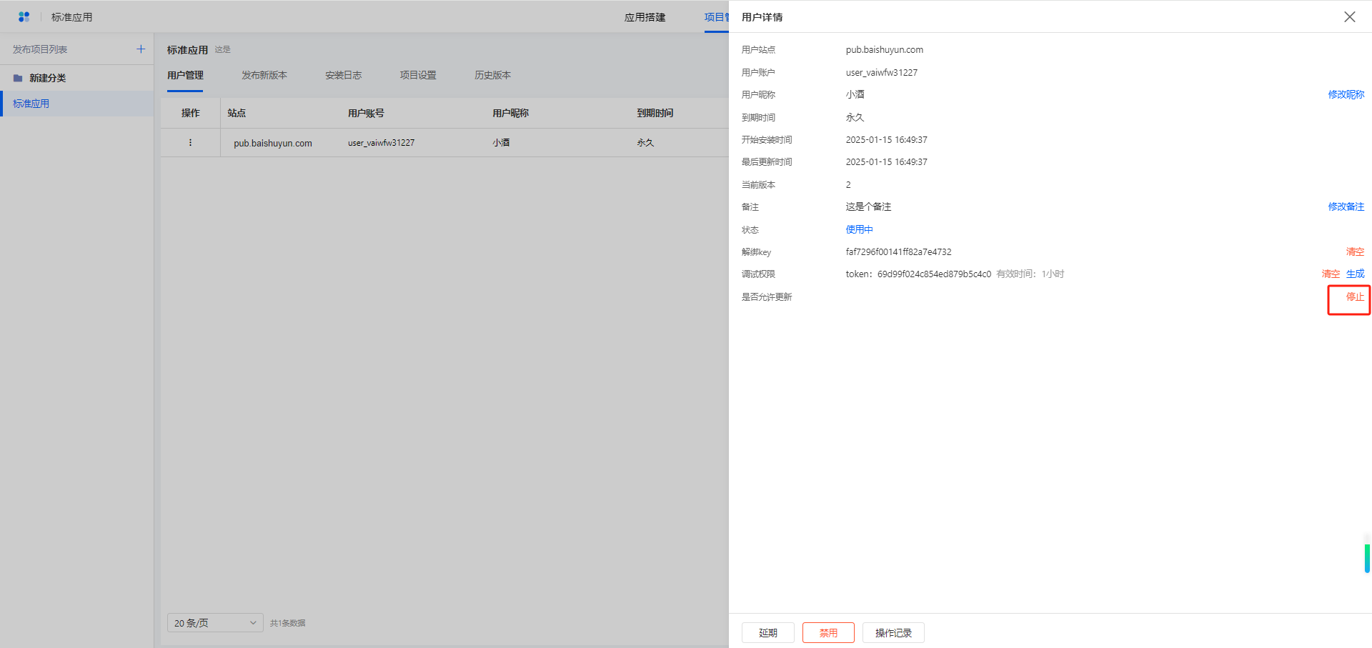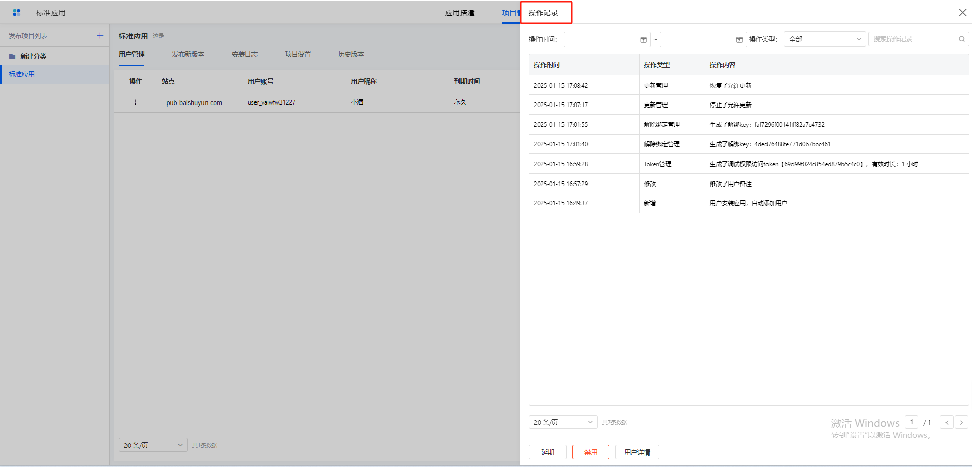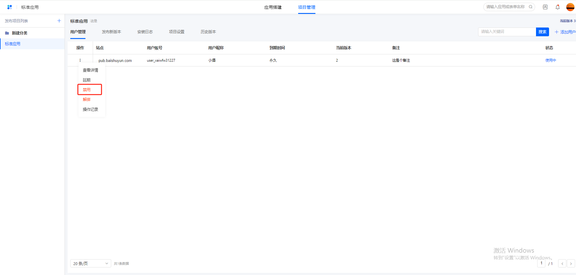 点击操作-禁用/启用,禁用的用户则不能使用该标准应用,启用后则继续使用。如下图所示: