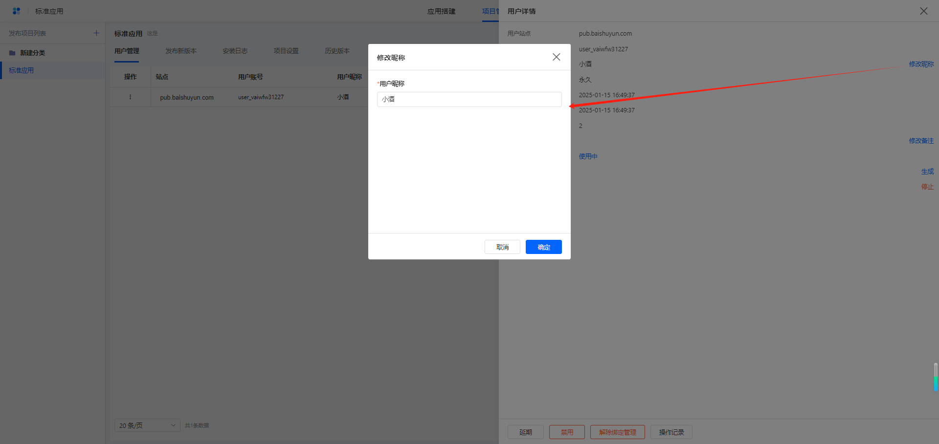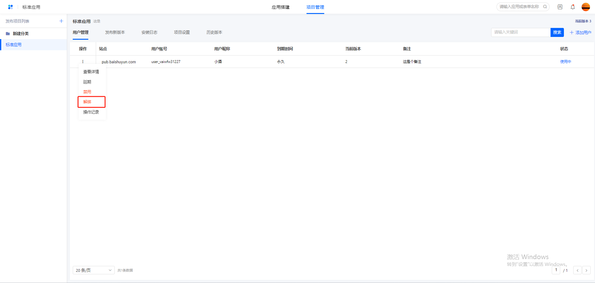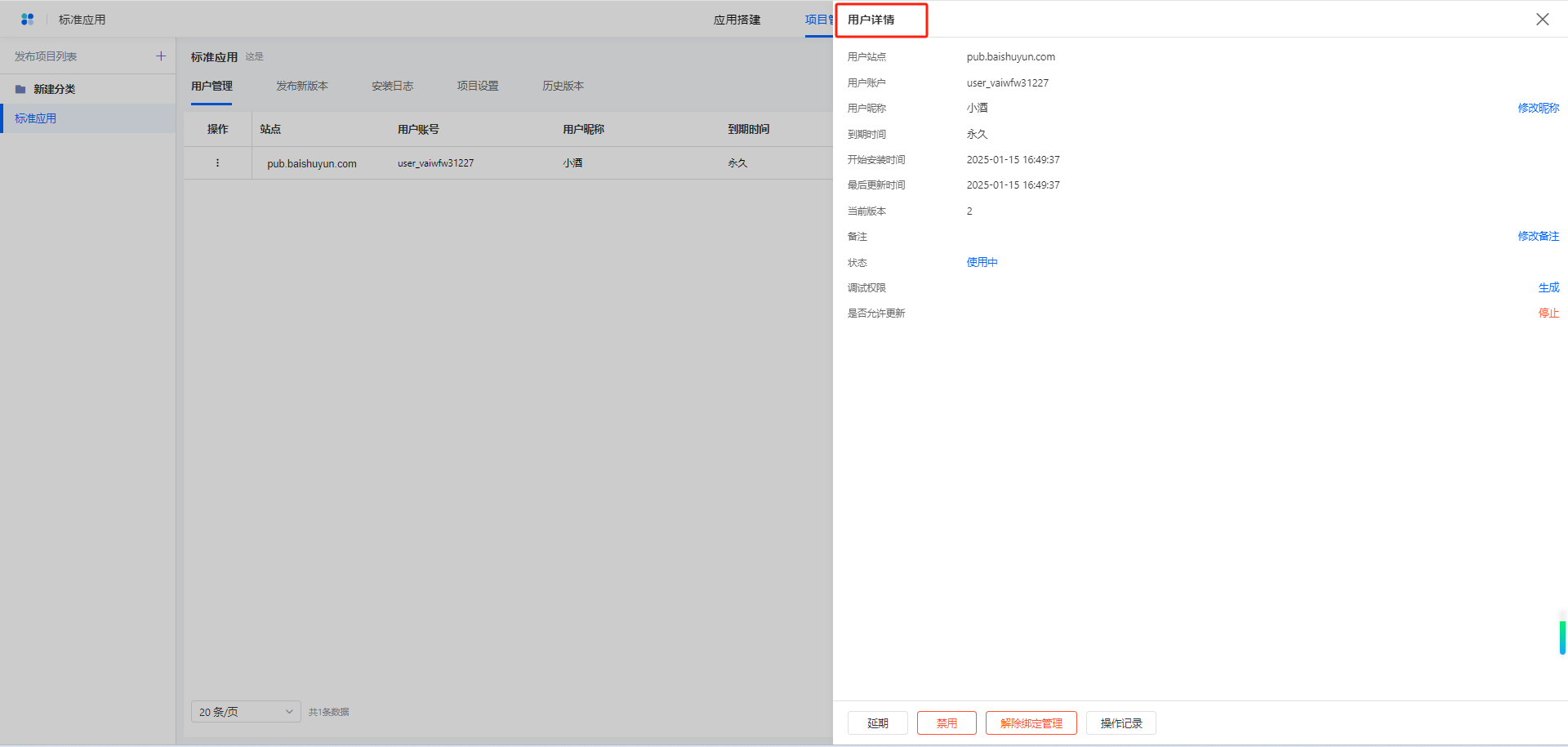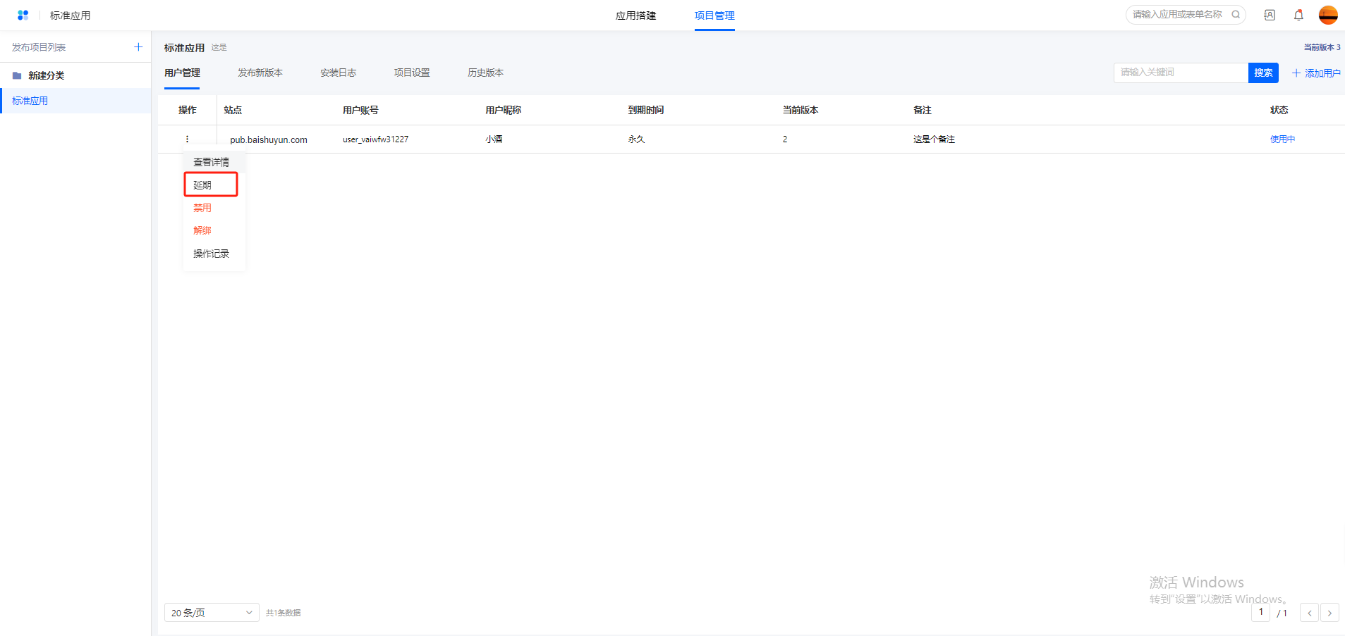 点击操作-禁用/启用,禁用的用户则不能使用该标准应用,启用后则继续使用。如下图所示: