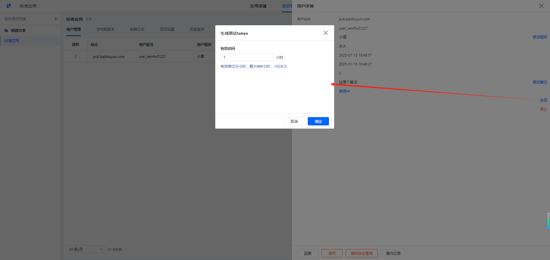 3)项目管理>用户管理>>用户详情,调式权限的有效时间,根据使用者开启调式功能开始计算。