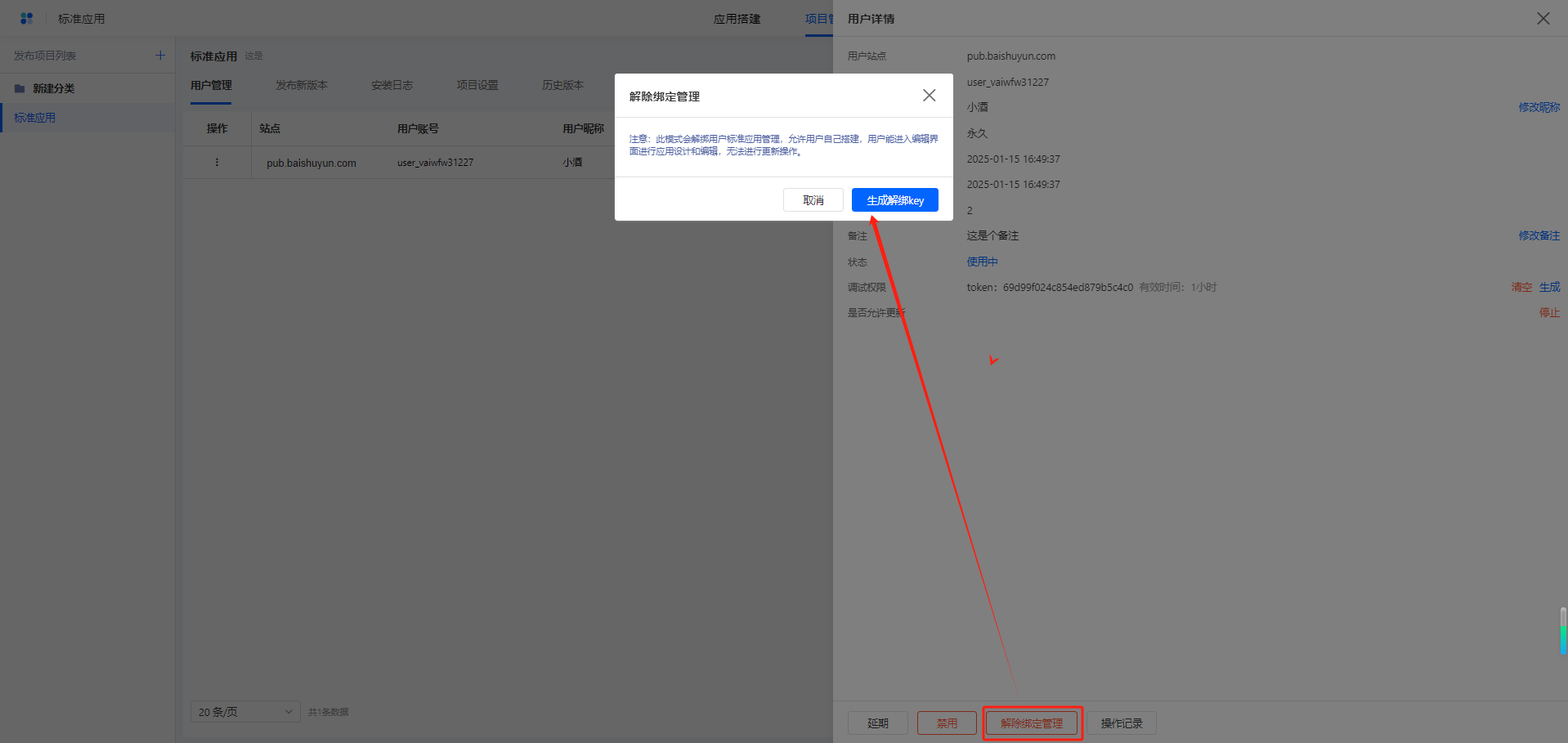 点击操作-解绑,用户详情会生成解绑key,使用者可操作解绑。如下图所示: