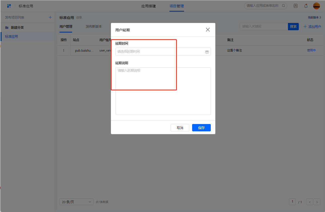 点击操作-延期,支持用户延长到期时间。如下图所示: