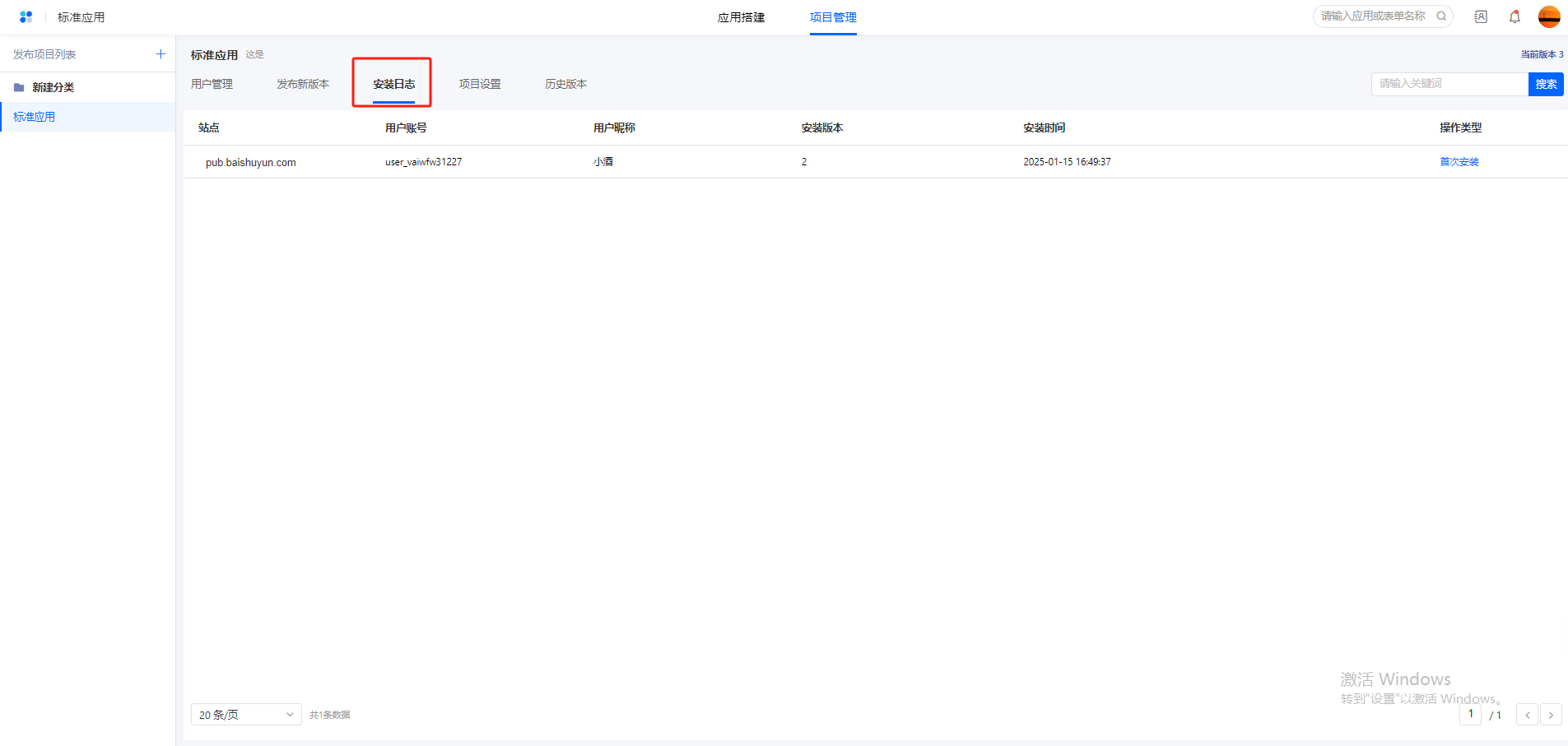 点击左侧项目,右侧面板点击「安装日志」,记录项目所有用户的安装日志。如下图所示: