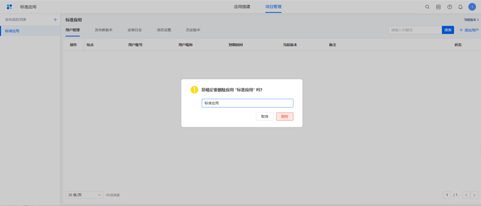 点击项目名称右侧 删除按钮,弹出二次确认弹窗 删除项目。如下图所示: