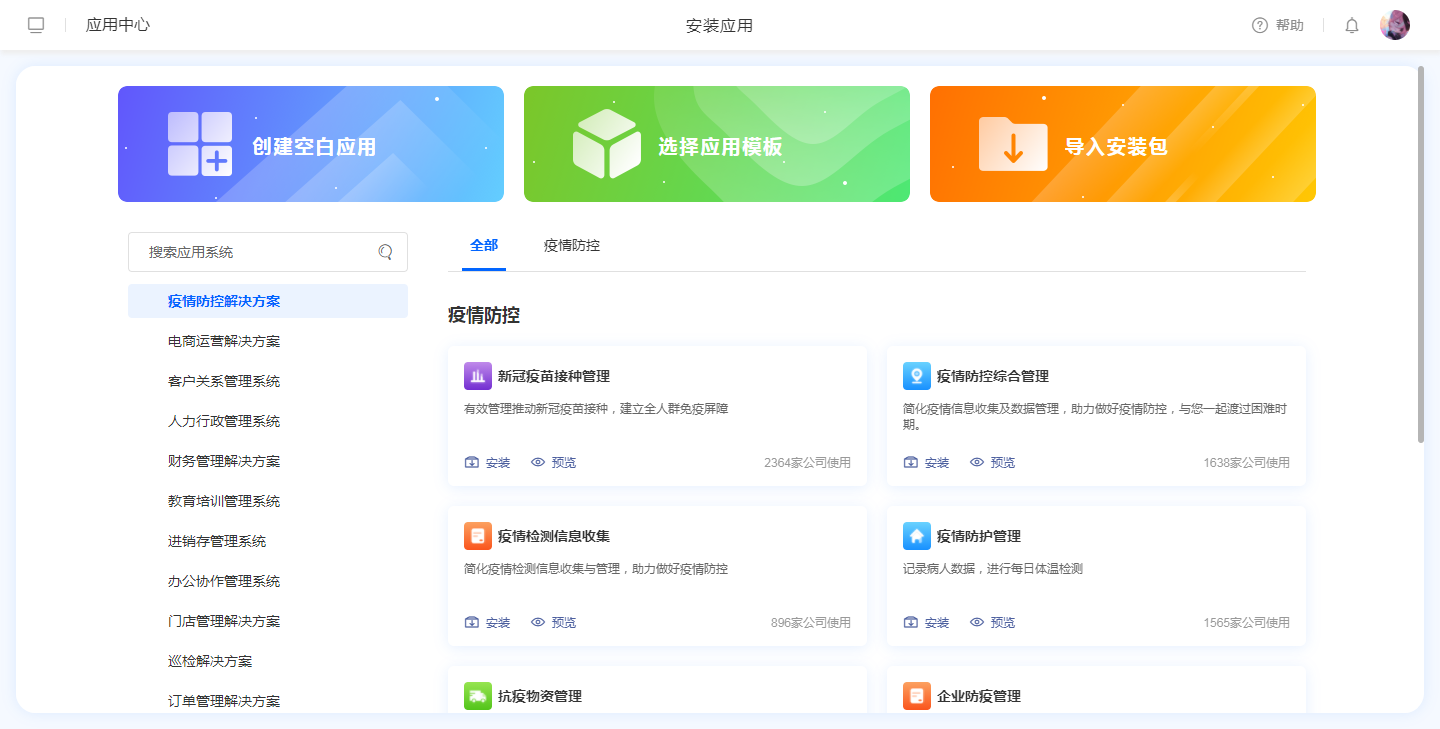 百数应用中心有近50的标准应用,全部安装即可投入使用,同时还有近120个各行各业的模板应用供用户参考,可自行修改。