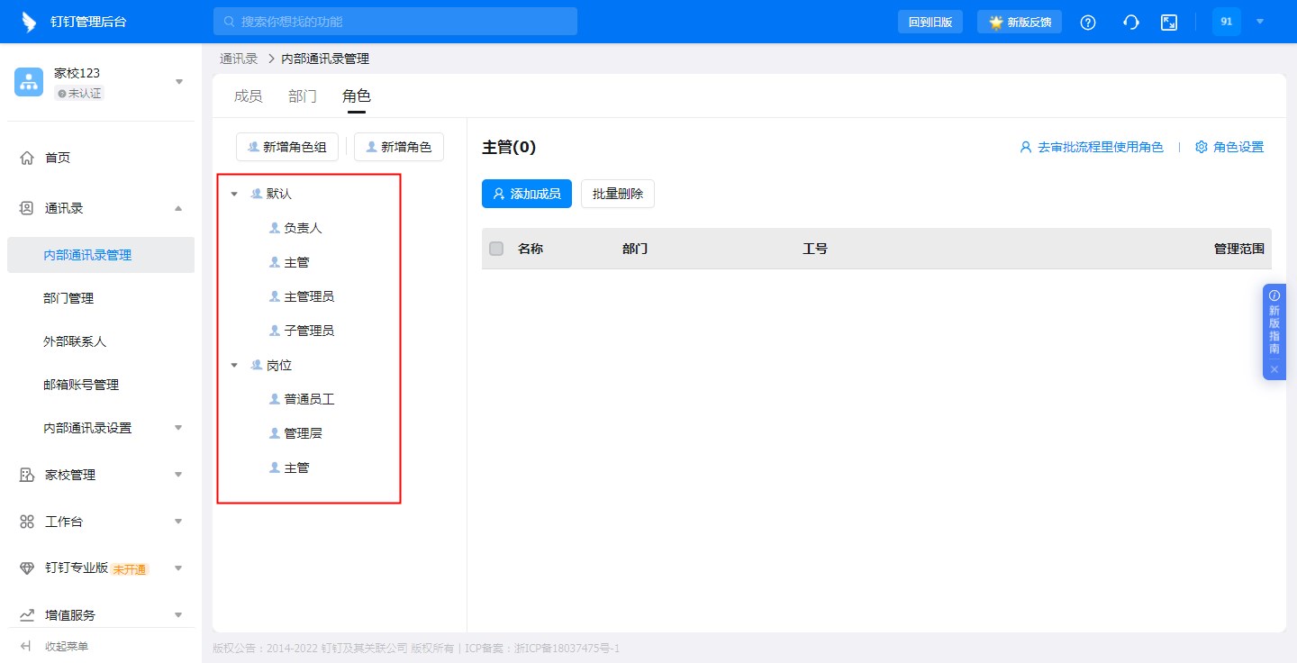 钉钉家校通讯录的成员同步到系统通讯录中,会根据身份自动加入家长、学生、老师部门,且拥有对应的家长/学生/老师职称。