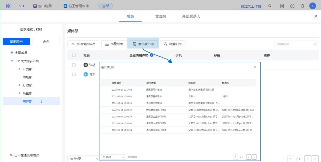 • 平台通讯录中默认会显示主部门信息,首次使用主部门功能时,建议手动同步更新信息后再使用。