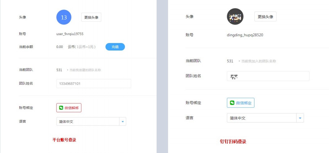 • 与钉钉绑定的系统账号权益不变,绑定/解绑钉钉不会影响系统账号的权益