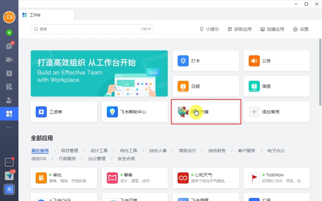 • 在工作台-全部应用下,找到创建的应用,点击该应用,可直接进入系统。