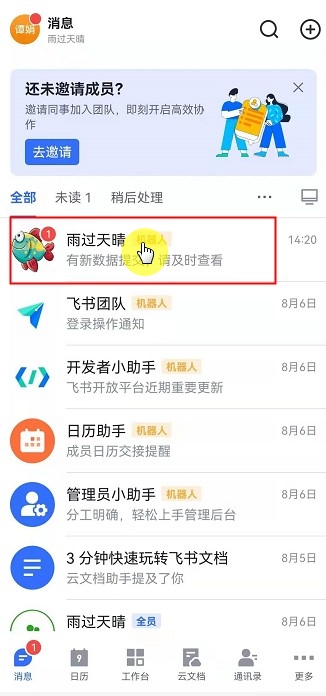 • 在消息列表中,收到推送消息,点击消息可以进行处理。