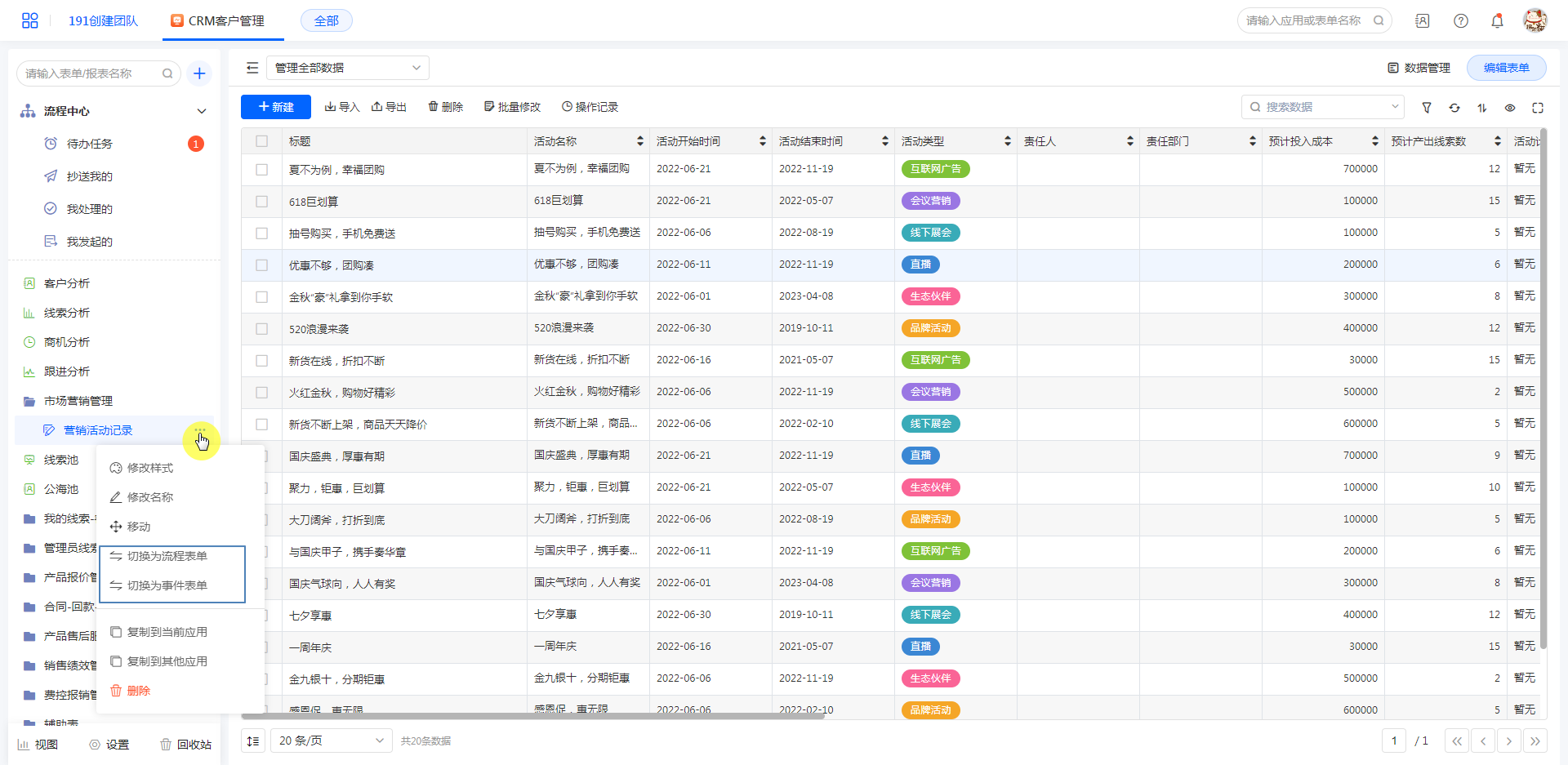 创建表单时,可根据需求选择需要的表单类型,在创建后,如业务发生变化需要转化为其他表单类型的也可以直接进行切换。