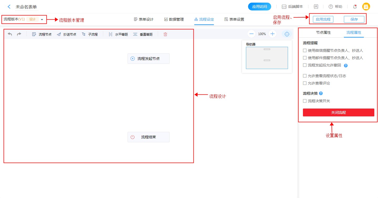 流程表单需要进行流程设定,包括流程图的设计以及节点属性和流程属性的设置,详见流程设计。