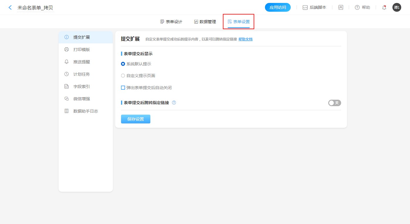 表单设置中包含了表单的一些扩展功能,进行相关配置后可实现更多的需求,详见提交扩展。