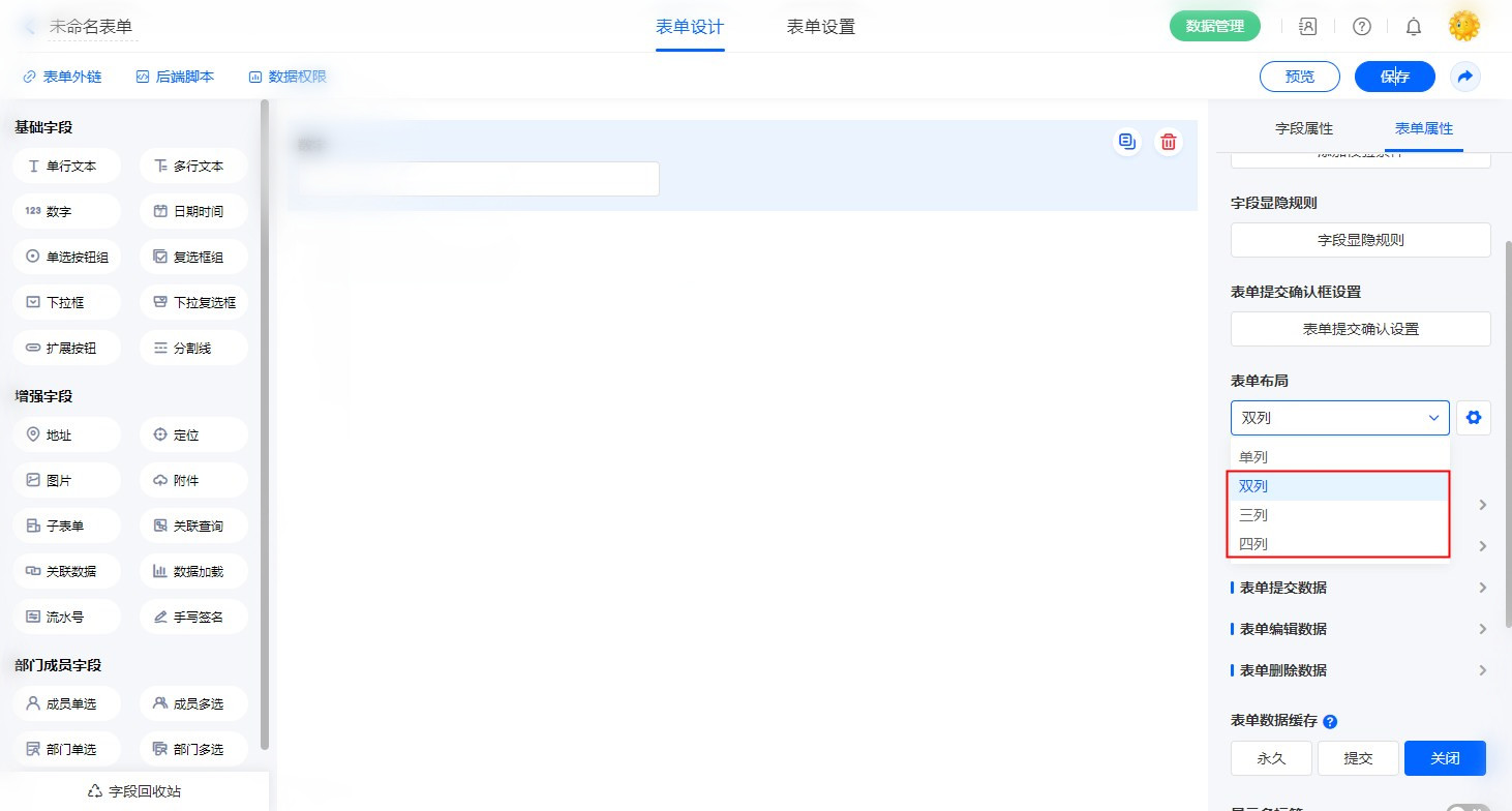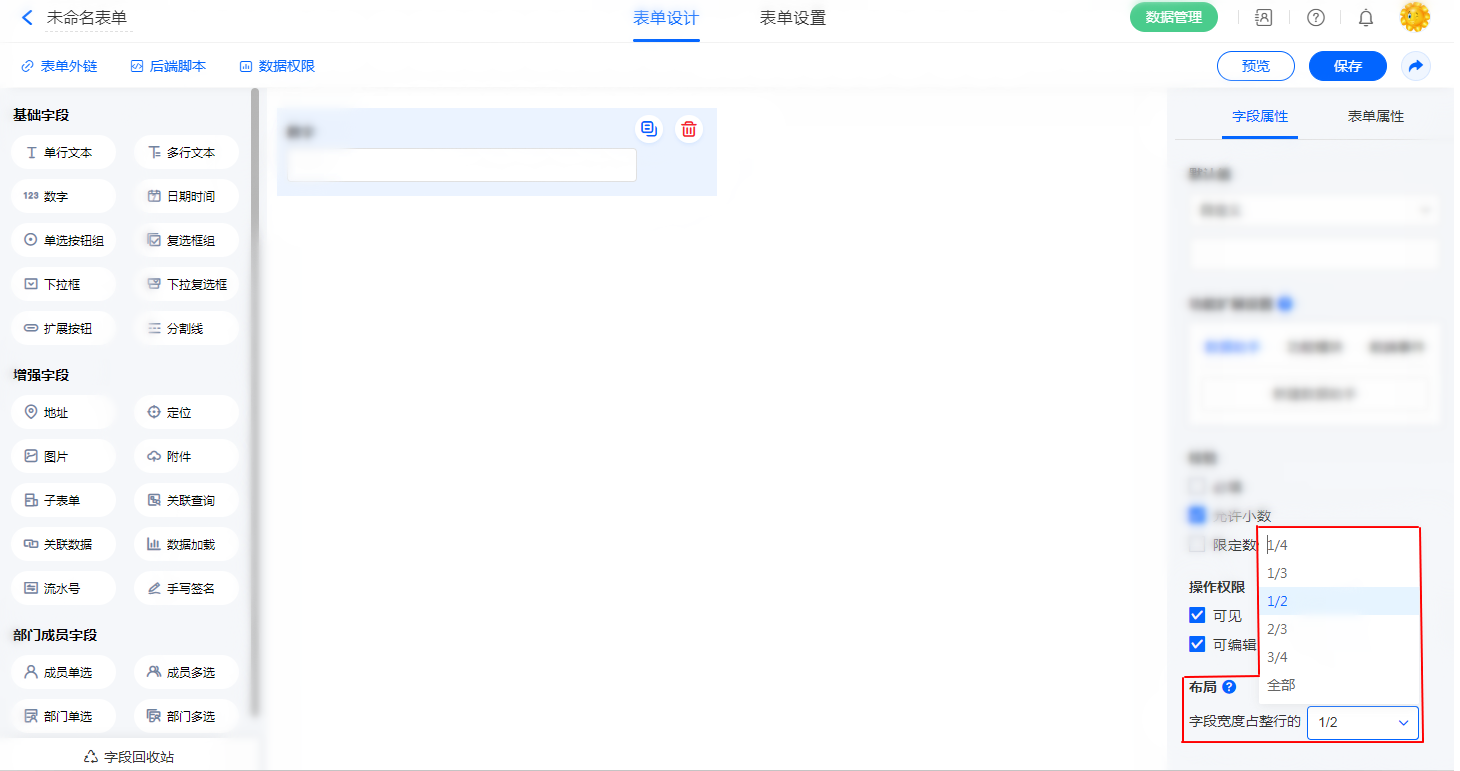 | 1、开启“表单属性”——“电脑端表单布局”,开启“多列” 2、设置“字段属性”--布局,支持的字段宽度有:1/4、1/3、1/2、2/3、3/4 和整行 更多布局设计参考:表单布局 |