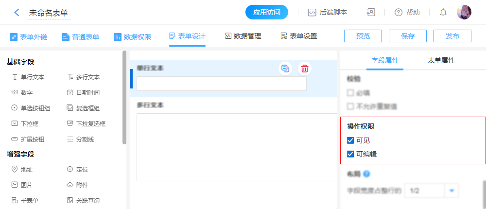注意:流程表单字段的操作权限在“流程设置”-“节点属性”中定义,此处的设置无效。