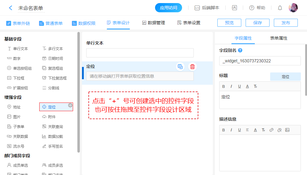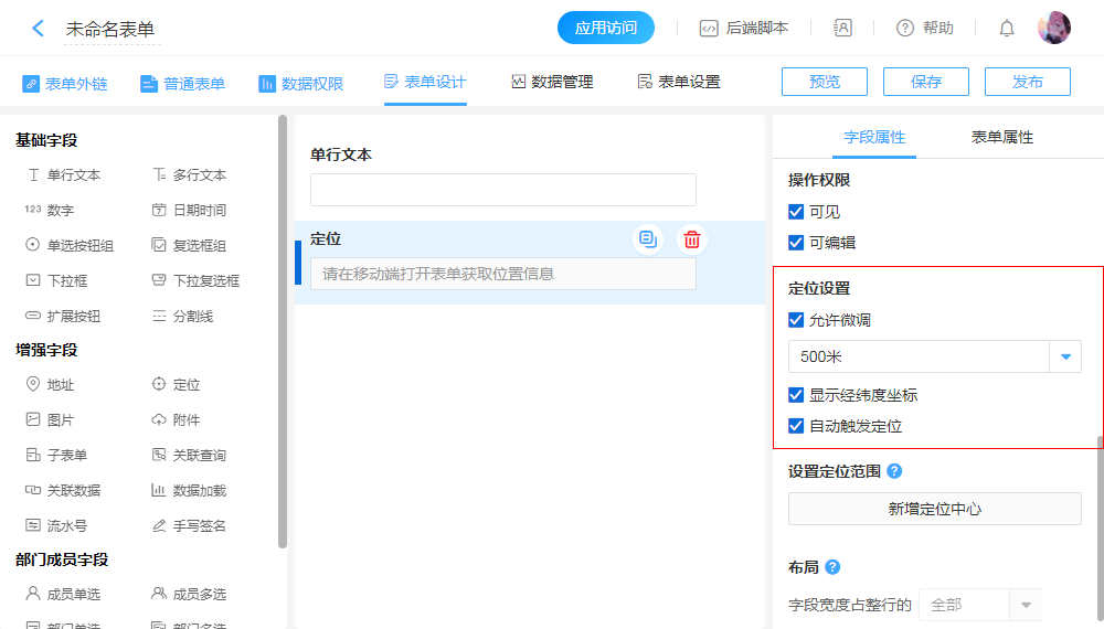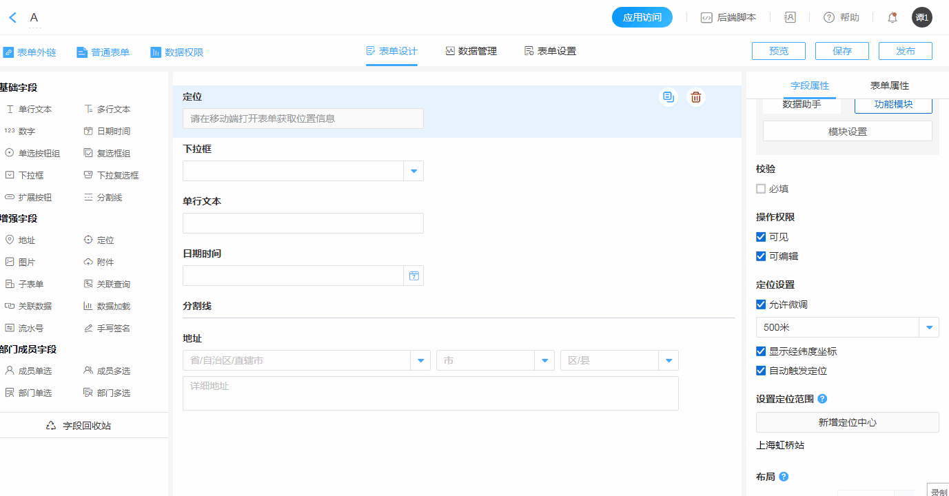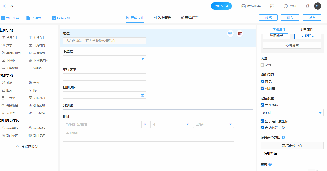 “定位”字段用于在“移动端”定位获取当前所在位置。