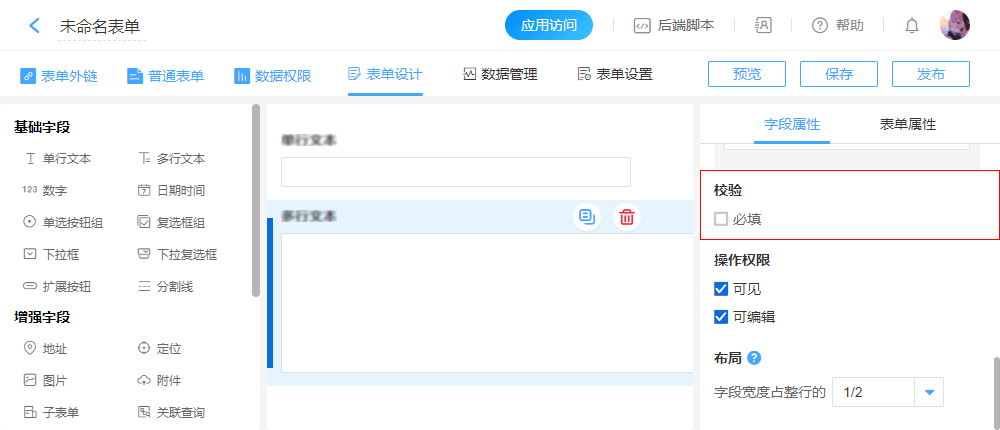 1、开启“表单属性”——“电脑端表单布局”,开启“多列”