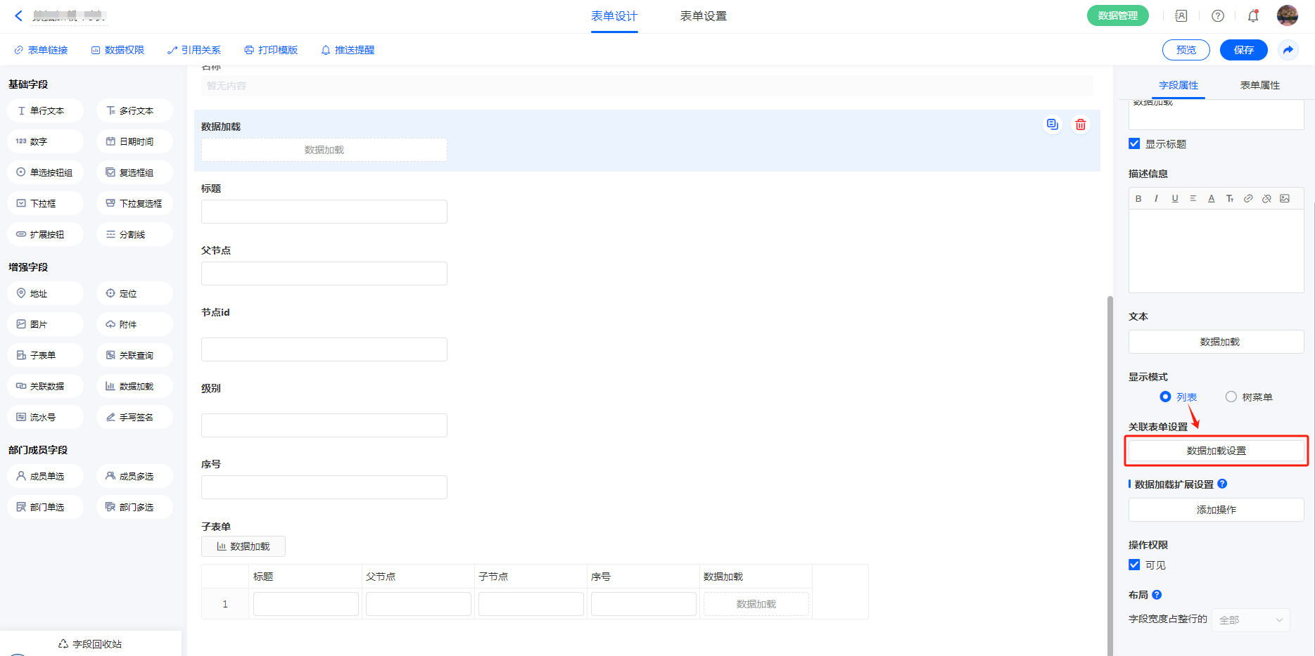 点击子表单的数据加载设置显示模式为【树菜单】即可设置子表单数据加载的数据源,并可进行具体的设置。