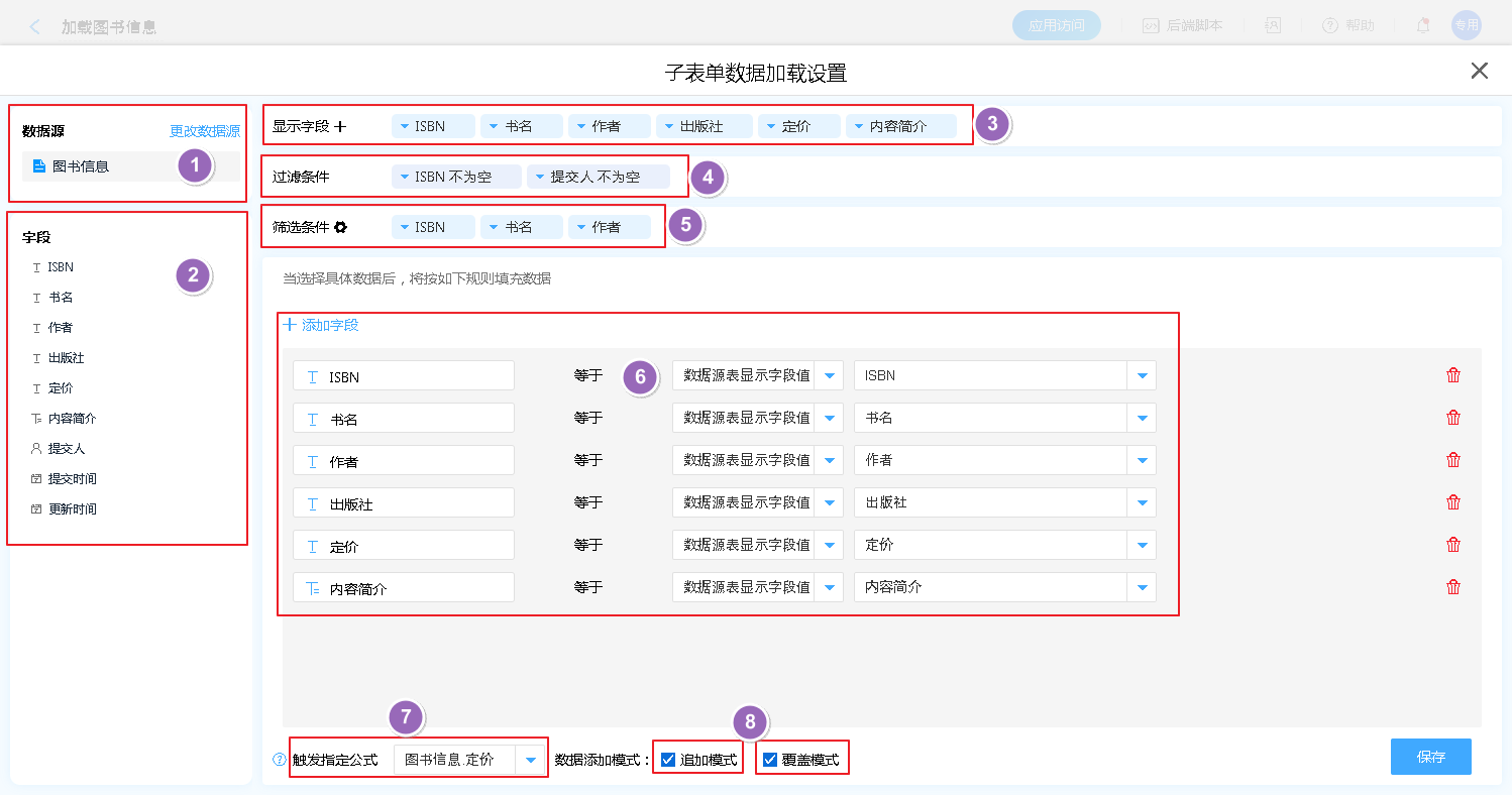 8. 数据添加模式: 子表单加载数据后,对原子表单内的数据的处理方式。