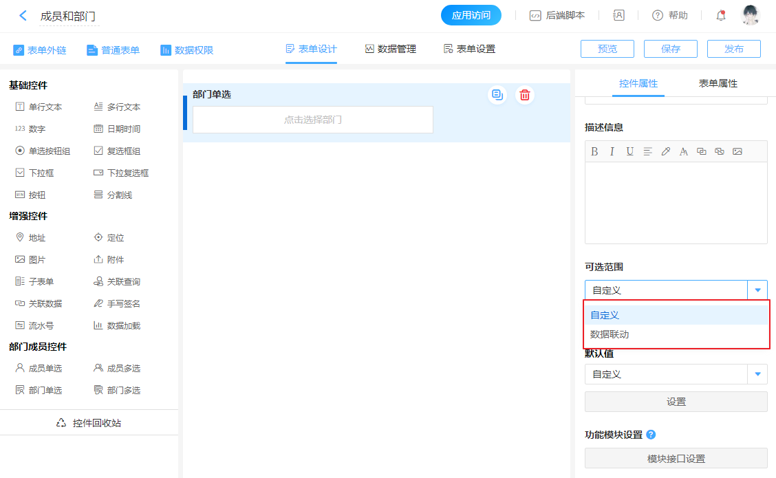 部门字段的可选范围如果设置数据联动,那么页面上不会展示默认值属性;可选范围为自定义时,页面会展示默认值属性。