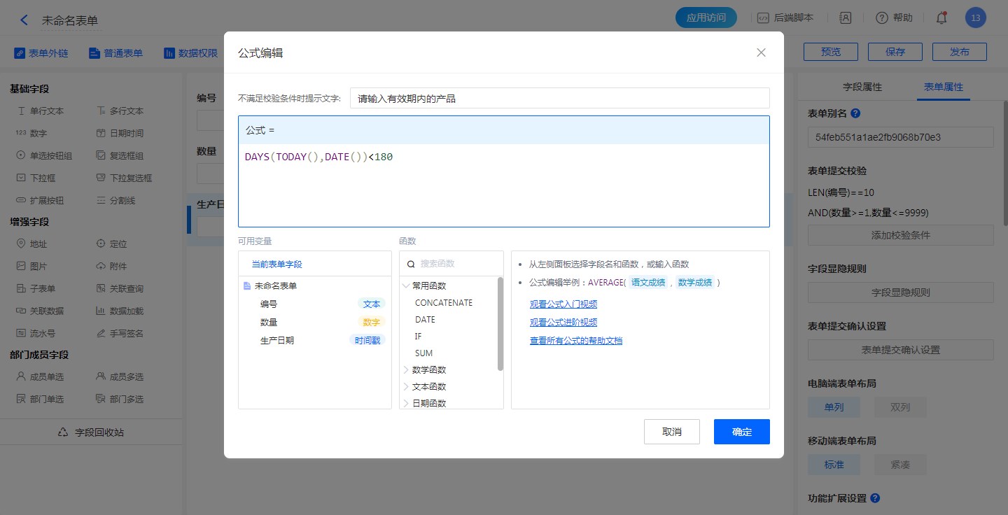 • 公式为:DAYS(TODAY(),DATE(生产日期))<180。表示今天和生产日期之间的天数小于180天,才可以提交数据。