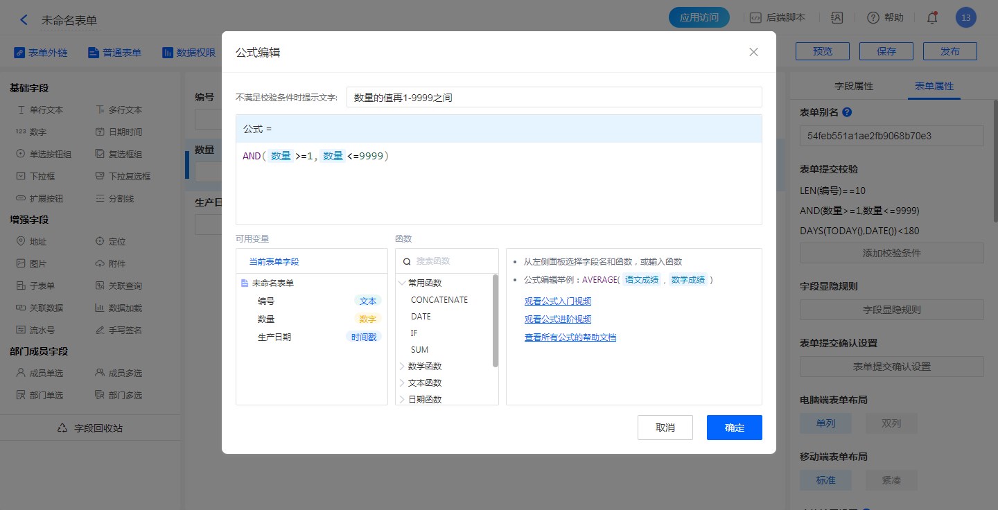 • 公式为:AND(数量>=1,数量<=9999)。表示当数量>=1和数量<=9999同时满足时,才可以提交数据。