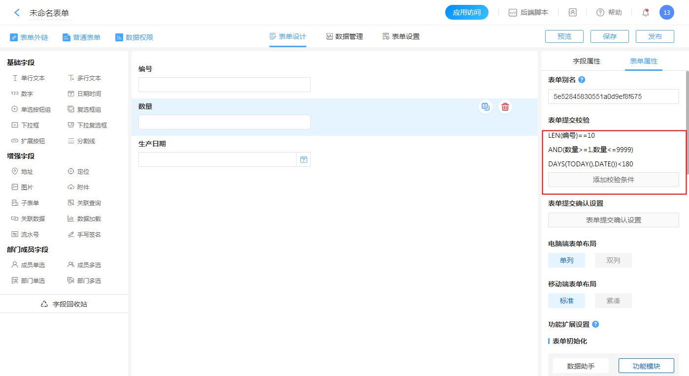 提醒: 表单可以在表单属性中设置表单校验条件,校验数据,而流程表单开启流程后,表单属性中的校验条件设置不再生效,需要在流程设定-节点属性-更多属性-节点校验条件中设置该节点的校验条件。