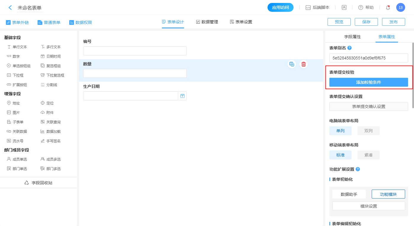 1. 【表单右侧-表单属性】——【添加校验条件】