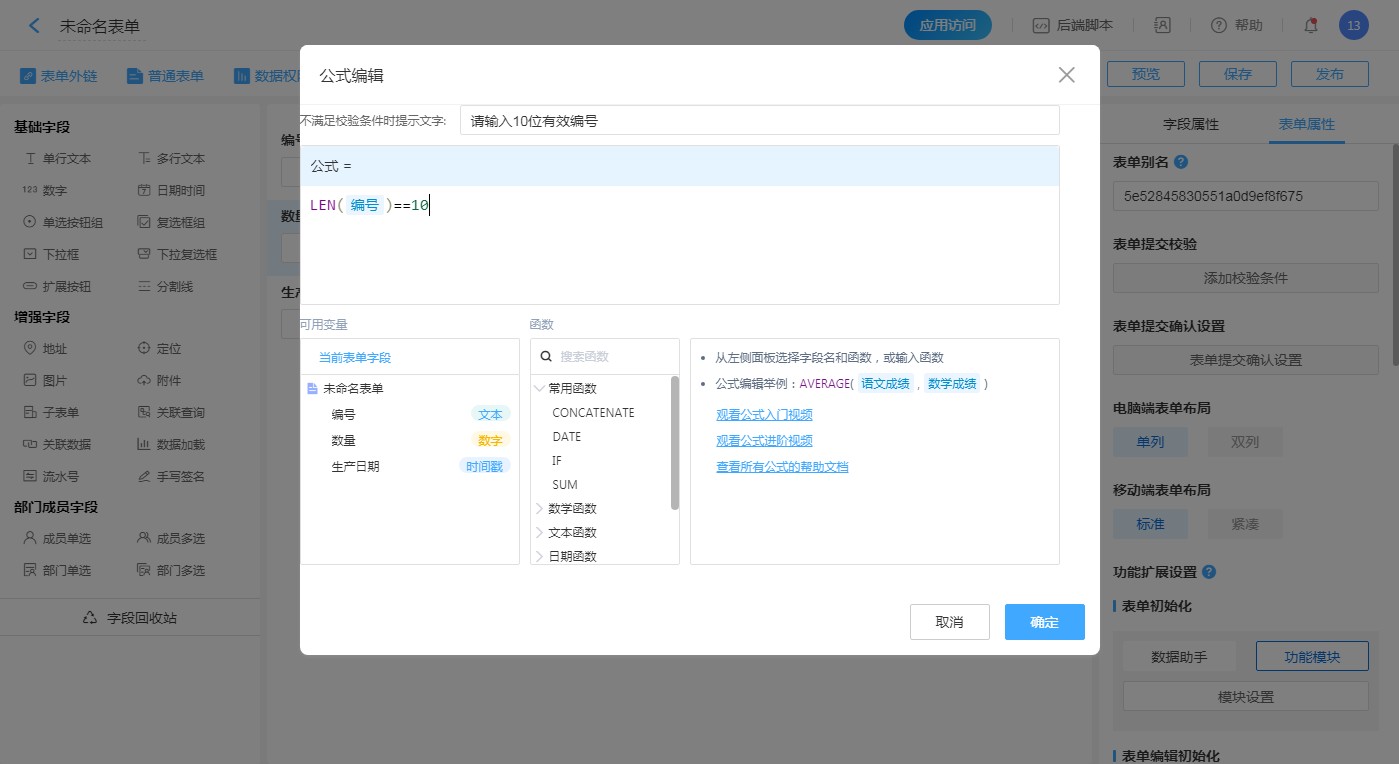 • 公式为:LEN(编号)==10。表示编码为10位时,才可以提交数据。