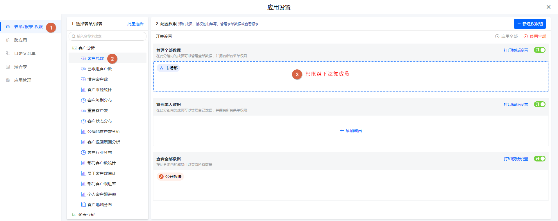 选择需要设置权限的表单/报表,设置成员/部门权限。
