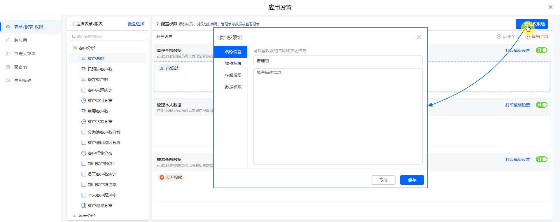设置入口:应用访问>>设置>> 表单/报表 权限