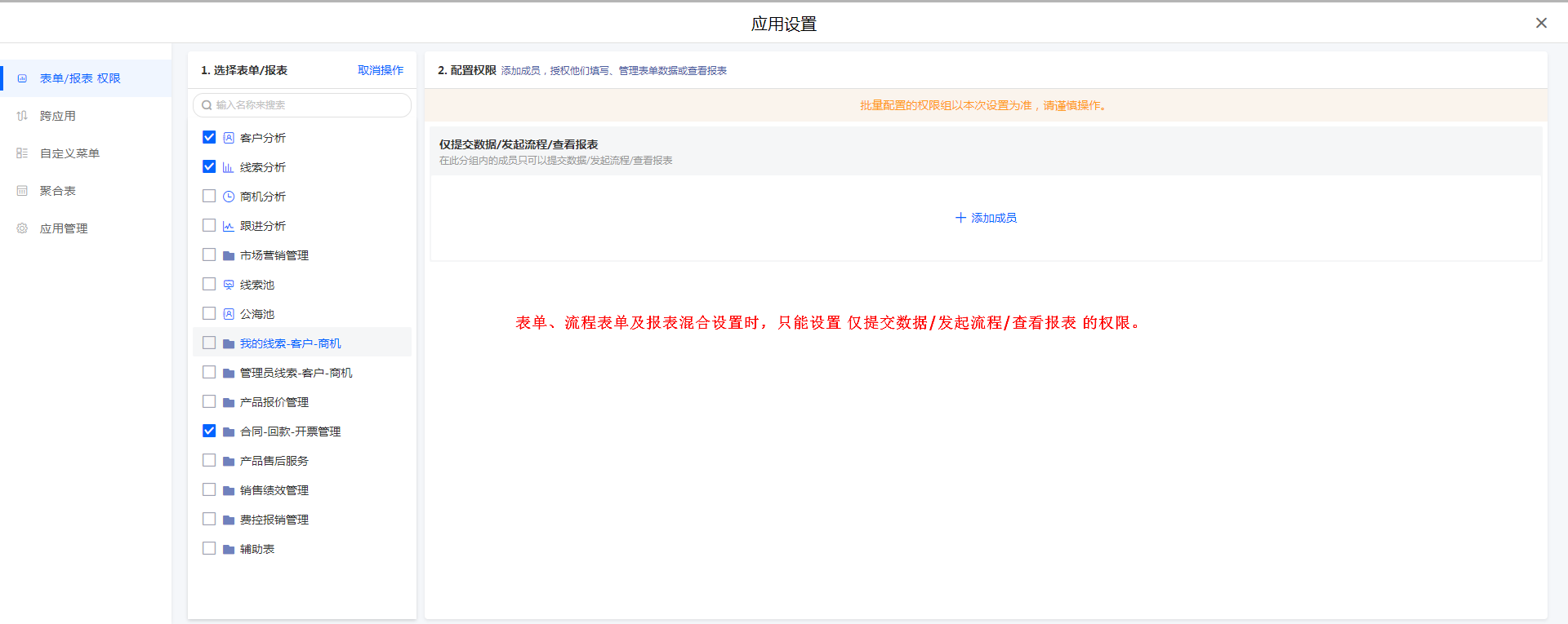 表单、流程表单及报表混合设置时,只能设置 仅提交数据/发起流程/查看报表 的权限。