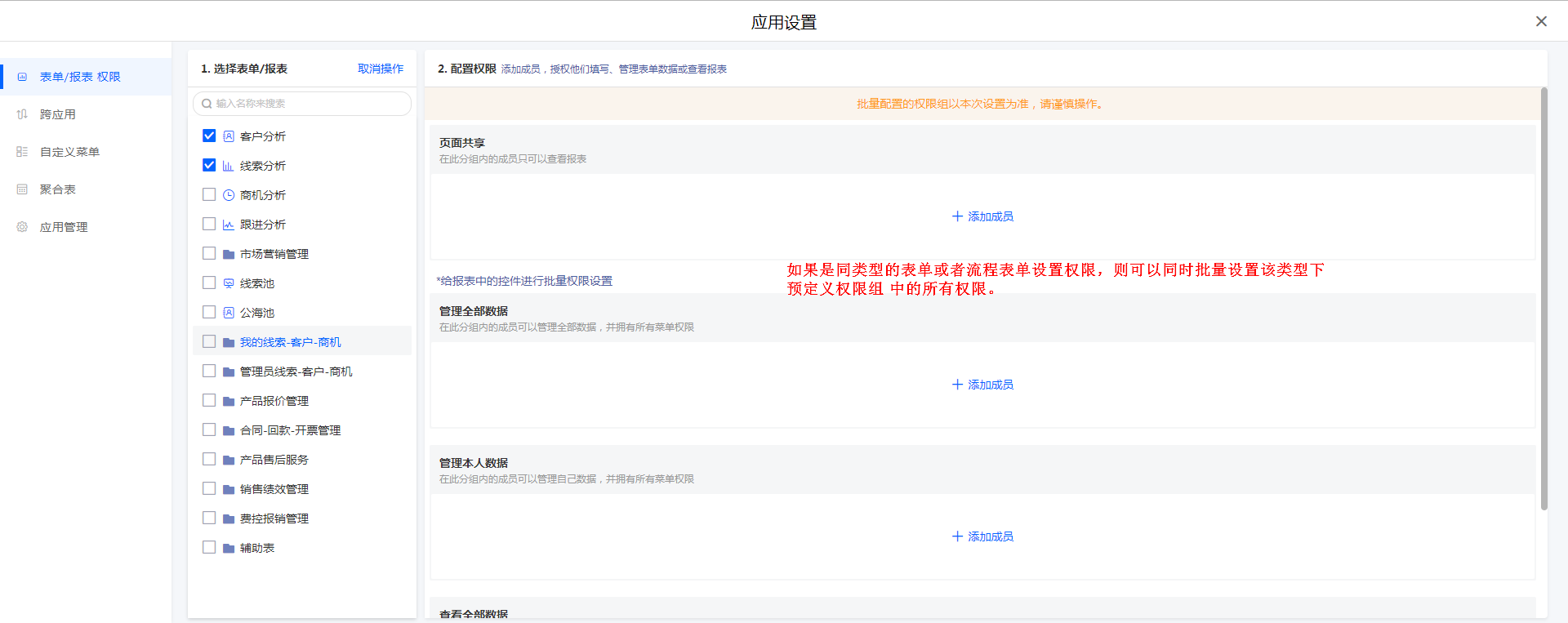 点击「批量选择」,可以对表单报表批量设置权限。