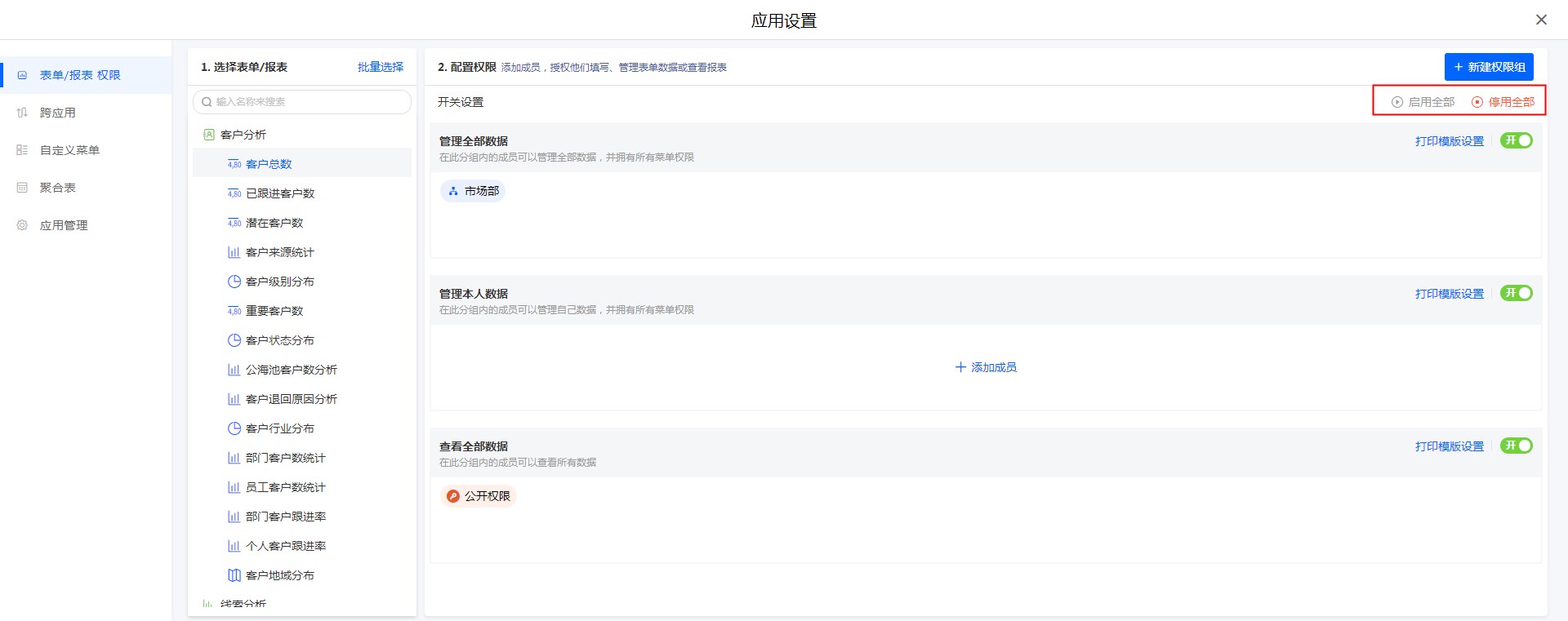 表单/报表权限支持在单个表单/报表设计页面设置,也支持在应用设置处统一管理。