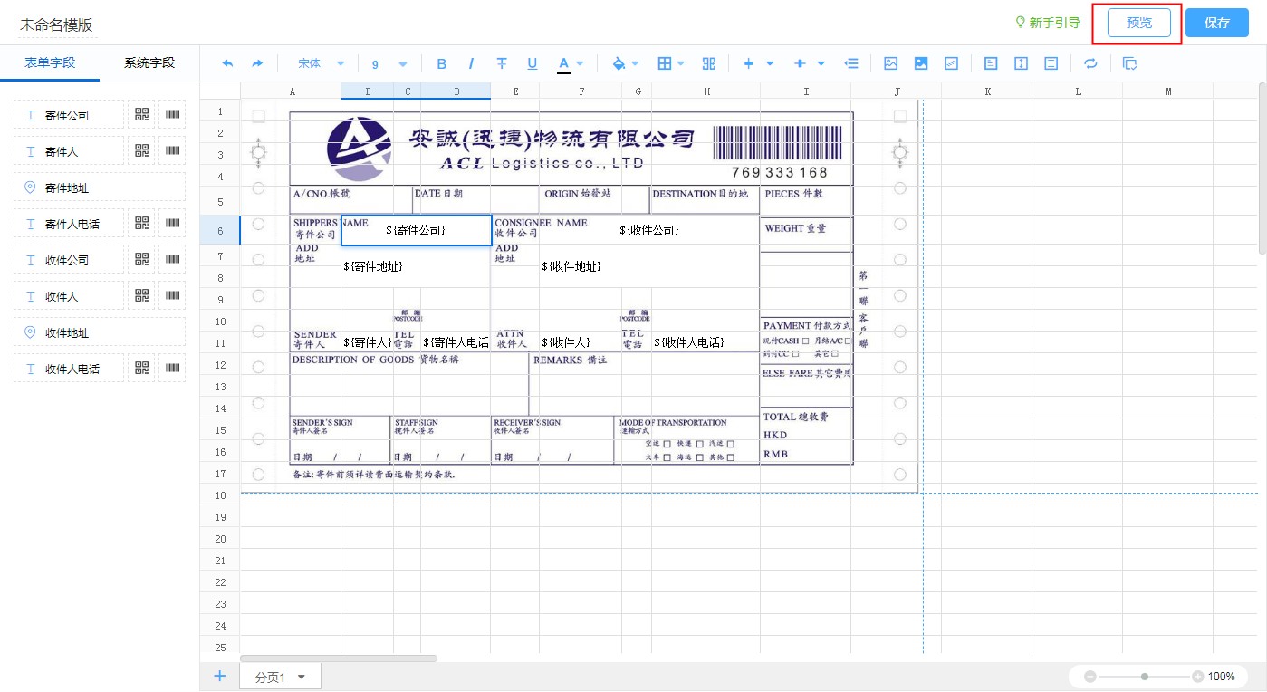 • 设计完成后,点击【预览】按钮,预览打印效果。